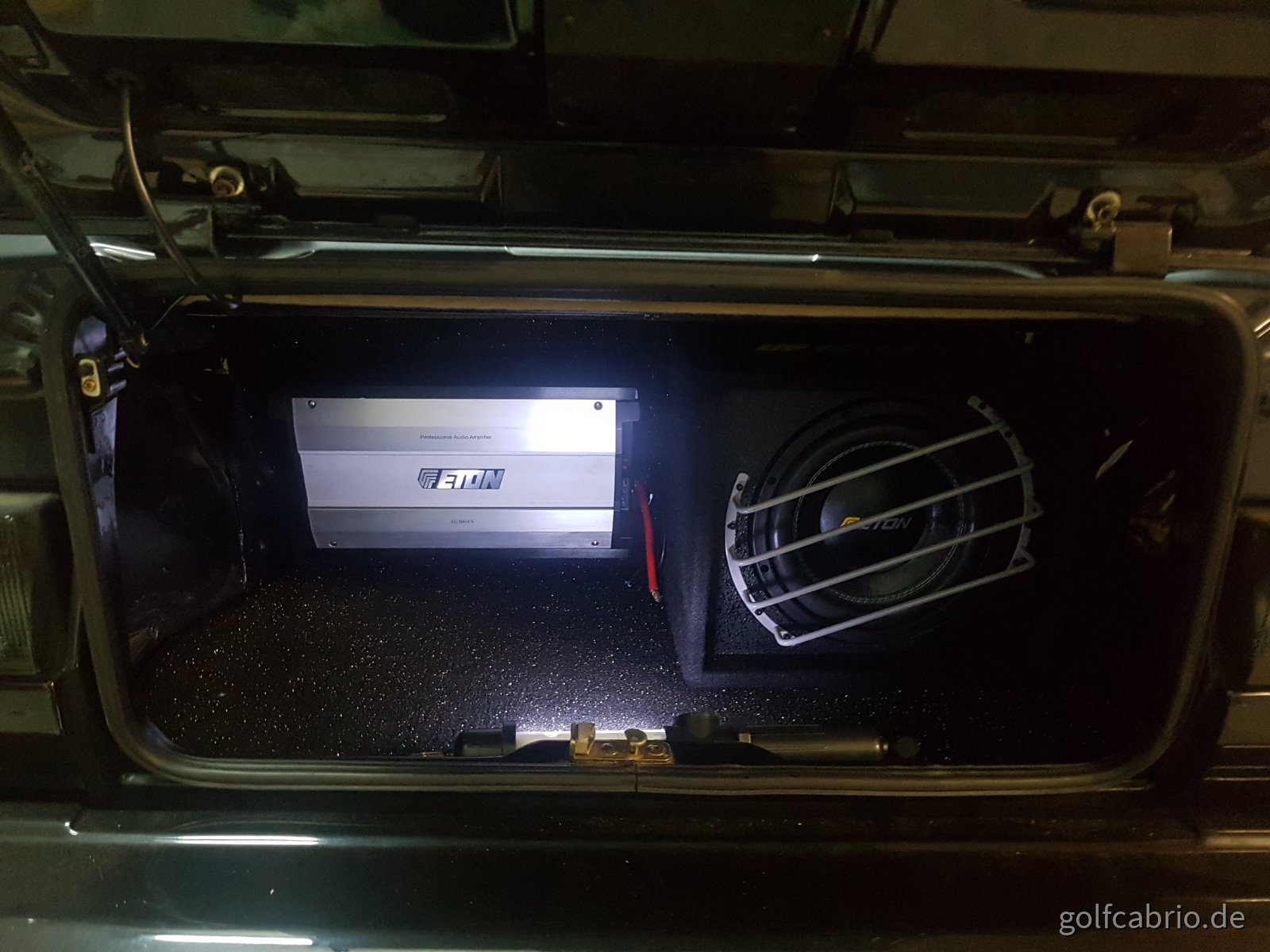 Die beschichteten MDF-Platten wollte ich eigentlich entfernen um selber eine Basis zu schaffen. Diese sind aber mit Silikon eingeklebt. Statt mit Gewalt rauszubrechen hab ich sie dann einfach drin gelassen. Allerdings fiel dann die Möglichkeit weg die Endstufe in die Reserveradmulde einzulassen. Ein aufgedoppelter Boden war jetzt auch nicht mehr Möglich wegen der Gehäusehöhe vom Woofer.