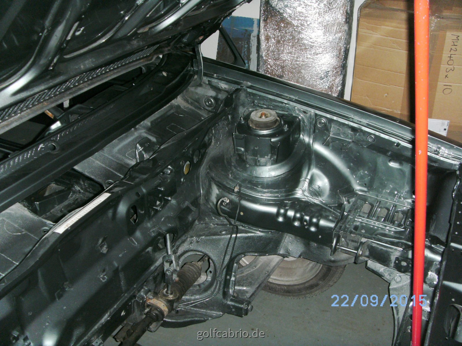 • Du siehst hier den Längsträger. Auf der Beirahrerseite ist ein Loch mit einem Stopfen verschlossen und etwas weiter in Richtung Spritzwand ist das andere mit einem Tape verschlossen. Es befindet sich zwischen Motorlageraufnahme und Kraftstoffleitungen.