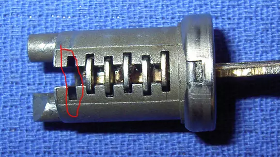 Da wo der rote Kreis ist sitzt bei beiden Zylinderarten der "Rausrutsch-Verhinderer" - der wird ebenfalls mit einer Feder montiert und hat nur den Zweck den Zylinder sicher in der Kunststoff-Führung zu halten damit er nicht wieder mit dem eingeschobenen Schlüssel rausflutschen kann. Er wird vom Schlüssel nicht beeinflusst da er auf einer Seite "offen" ist.