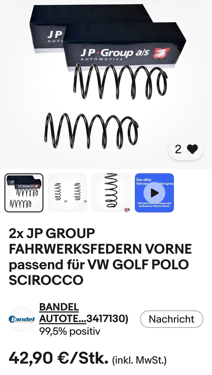 an meinen 2H habe ich vorne Federn von JP Group Verbaut, welche weiss ich jetzt nicht genau, waren aber von Bandel Autoteile für 25 Euro glaube ich, Ausgeschrieben für Golf 1 Cabrio und Polo ? Aufjedenfall waren diese etwas kürzer.