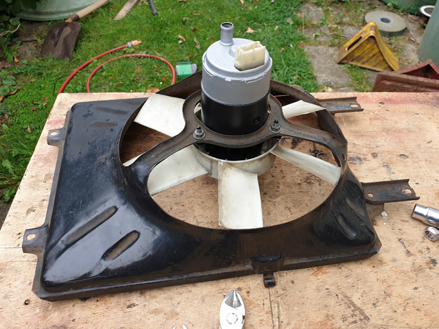Zweites Problem: Was im G2 oder dem Cabrio ab 84 ist mit einem Stecker der bei mir nix zu suchen hat. So einer mit der Drahtklemme. Also recherchiert, Audi hat in den 80ern noch normal einen Stecker mit Gummitülle verbaut. Stecker mit Tülle gefunden. Lüfter? Tja... gar nicht so einfach. Aber dann doch Erfolg gehabt. Ist einer für den Doppellüfter, 6 Flügel und reichlich Power. Und irgendwie verdammt lang, aber paßt noch rein ;) .