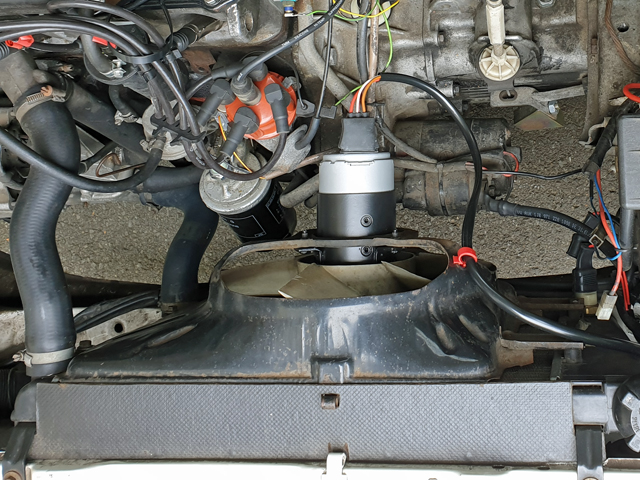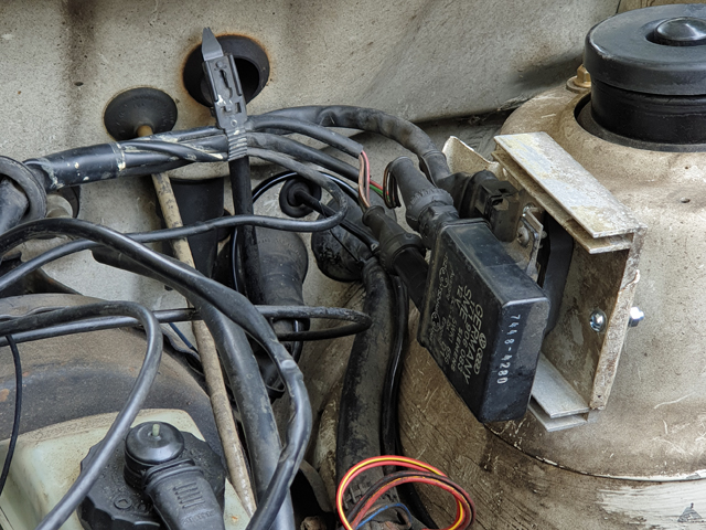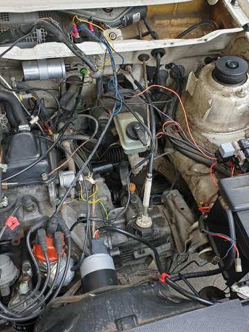 Da ich das Widerstandskabel noch drin habe wurde einfach eine Relaisschaltung genutzt. Die große Doppel-Dose am Zündverteiler ist mit dem großen Kühlerlüftermotor natürlich nicht so prickelnd. Vermutlich werde ich da den Anschluß für Früh verbiegen müssen. Immer bei Teilen die es nicht mehr gibt. Aber anders läuft er damit nicht. Nicht ruhiger, kein besserer Start. Da aber der Kram nur im Wasserkasten rumlag habe ich natürlich keine Probefahrt gemacht, nur kurz den ZZP auf 0 gedreht.