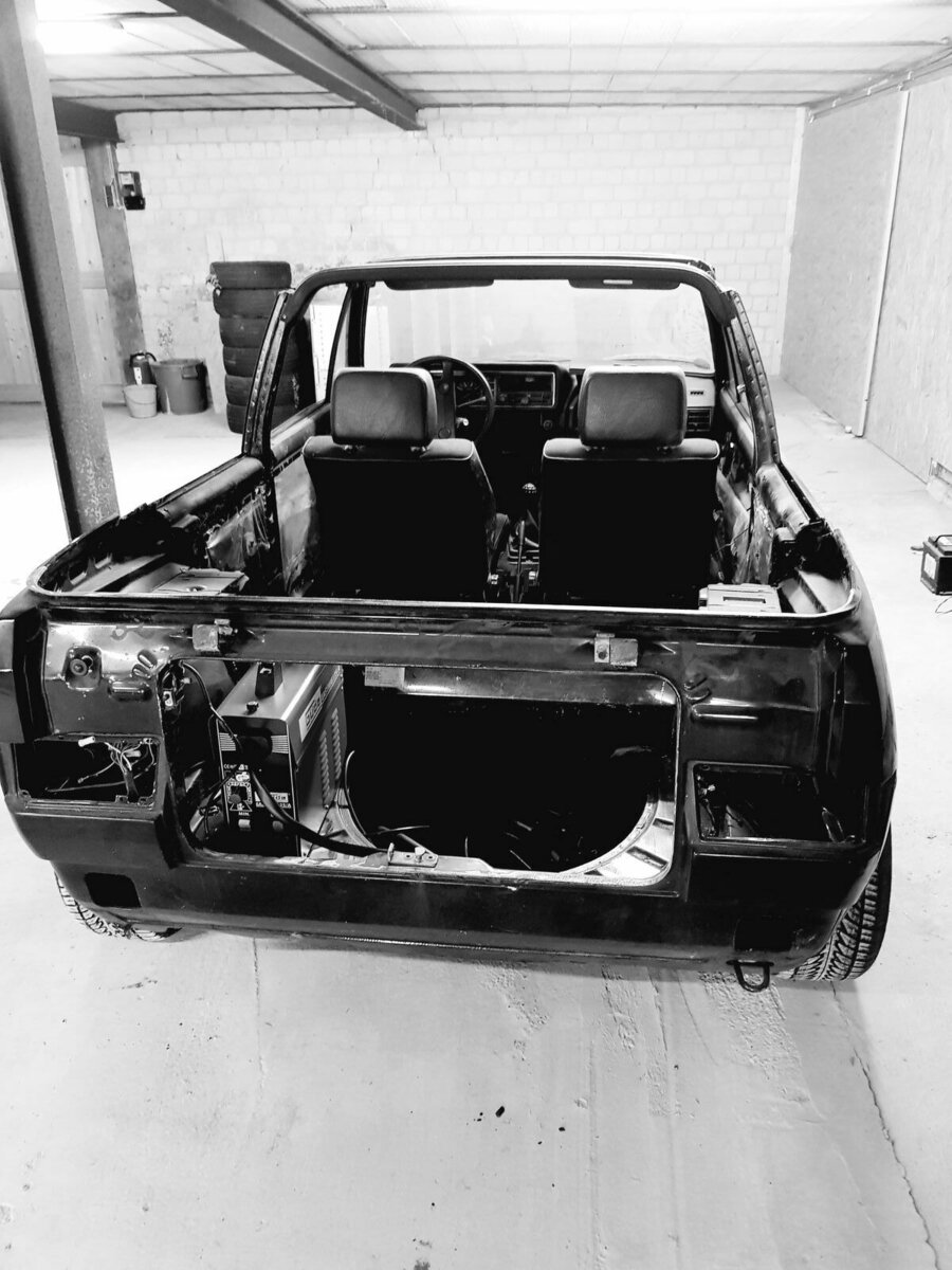 Der Reserveradmulde hat der ... den Boden raus getrennt um sie zu vergrößern und dort hinein die Batterien zu verlegen aus'm Motorraum. Zum Cleanen quasi..