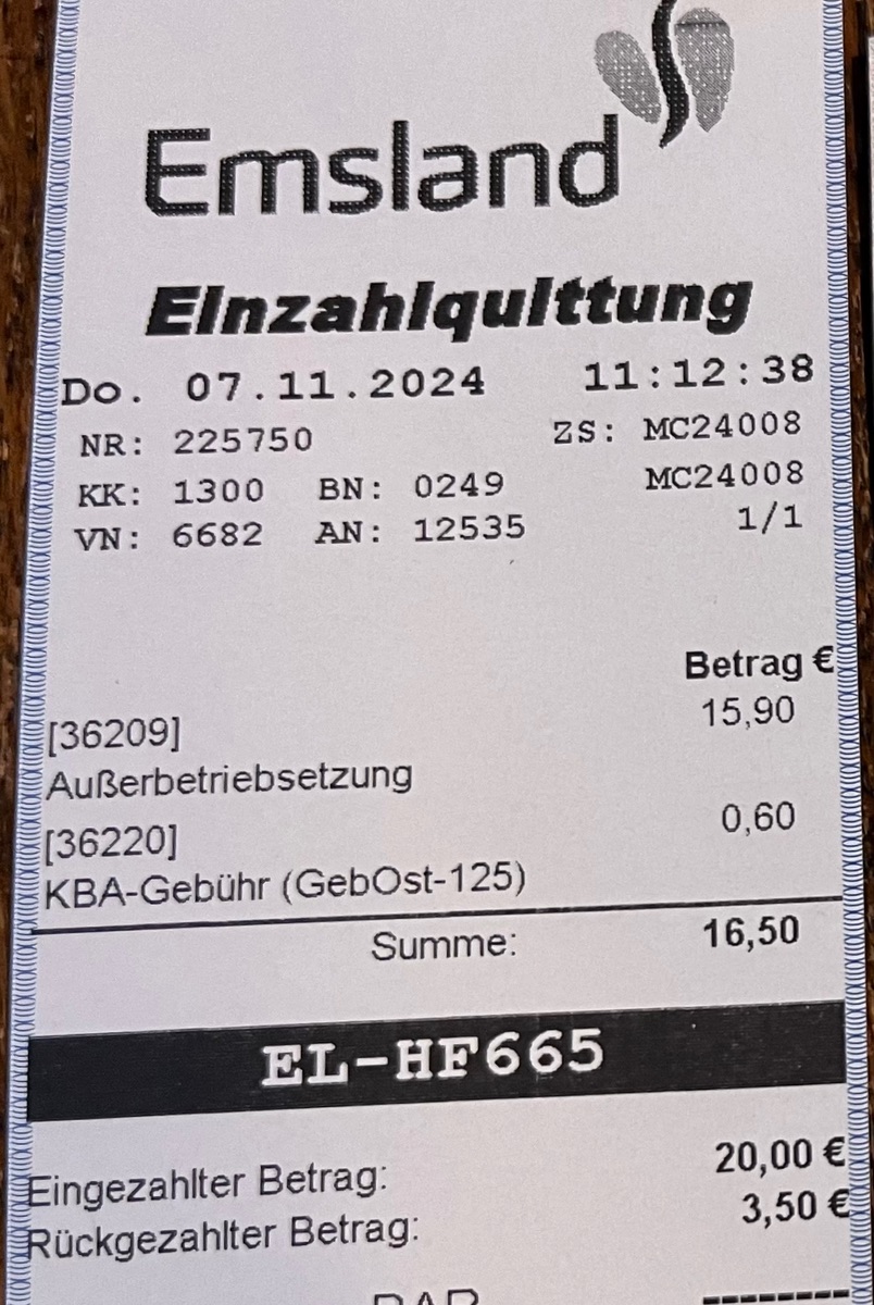 • Heute hat mich geärgert, das ich für die Stilllegung meines Cabrios über den Winter 16,50 € an Gebühren entrichten musste.