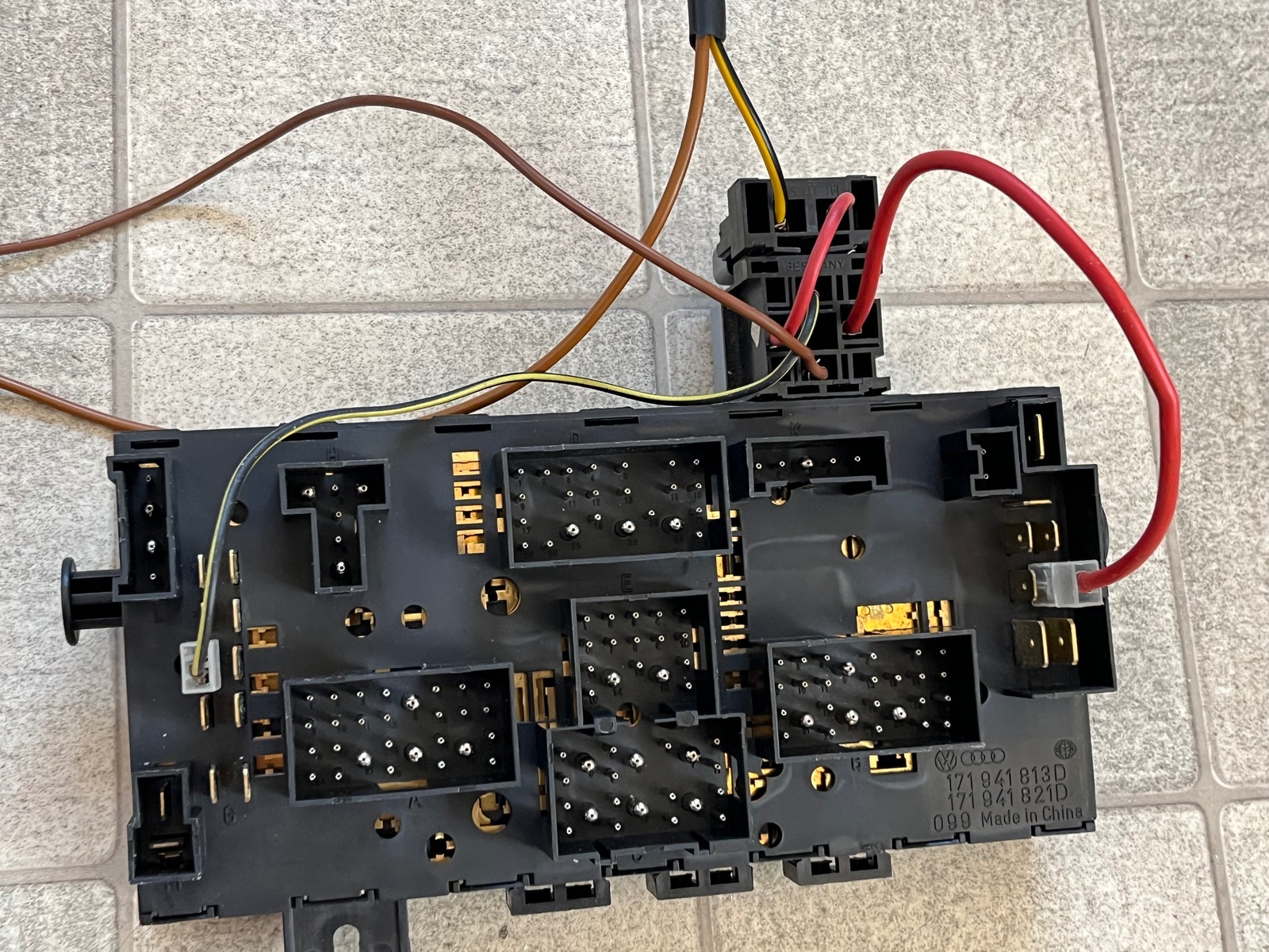 Auf dem Bild mit Sicherungskasten habe ich mal alles angesteckt. Der Anschluss für das geschaltete Plus is m. W. „G2. Masse kommt an den Massestern neben dem Sicherungskasten.Alle Steckverbindungen sind gecrimpt und mit Steckergehäusen versehen.
