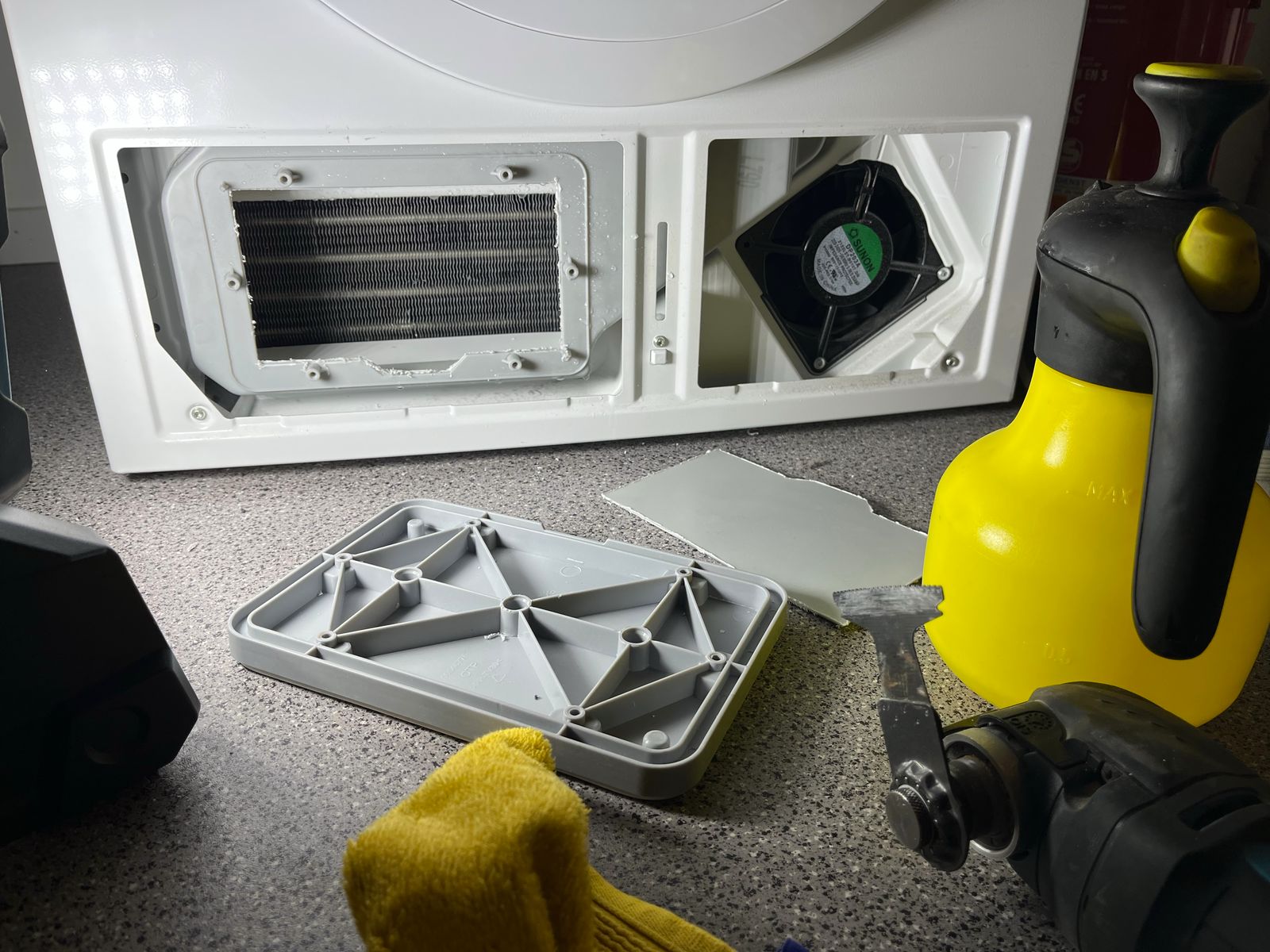 Youtube Video dazu geschaut, Wartungsklappe bei Ebay bestellt für 10 Euro (warum ist die nicht schon serienmäßig verbaut?). Dann gesägt, saubergesprüht und das Reinigungsprogramm für den Kondensator 20x durchlaufen lassen.