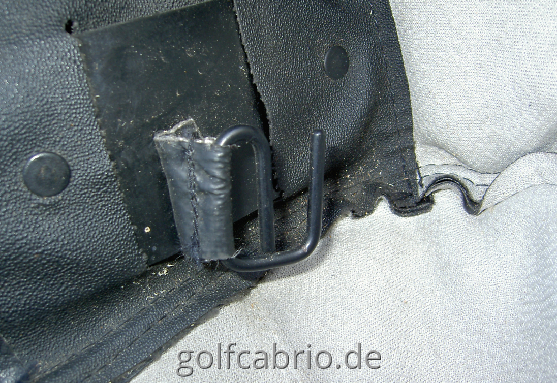laut betriebsanleitung wird die persenning hinten aussen an zwei haken am verdeck eingehängt, aussen seitlich per druckknopf befestigt und innen zum einen per klettbändern an der kofferraumabdeckung und: