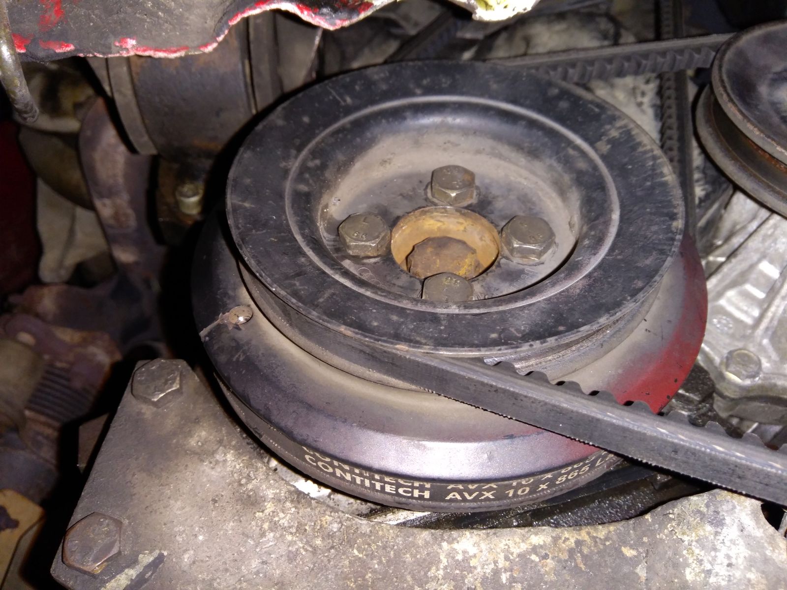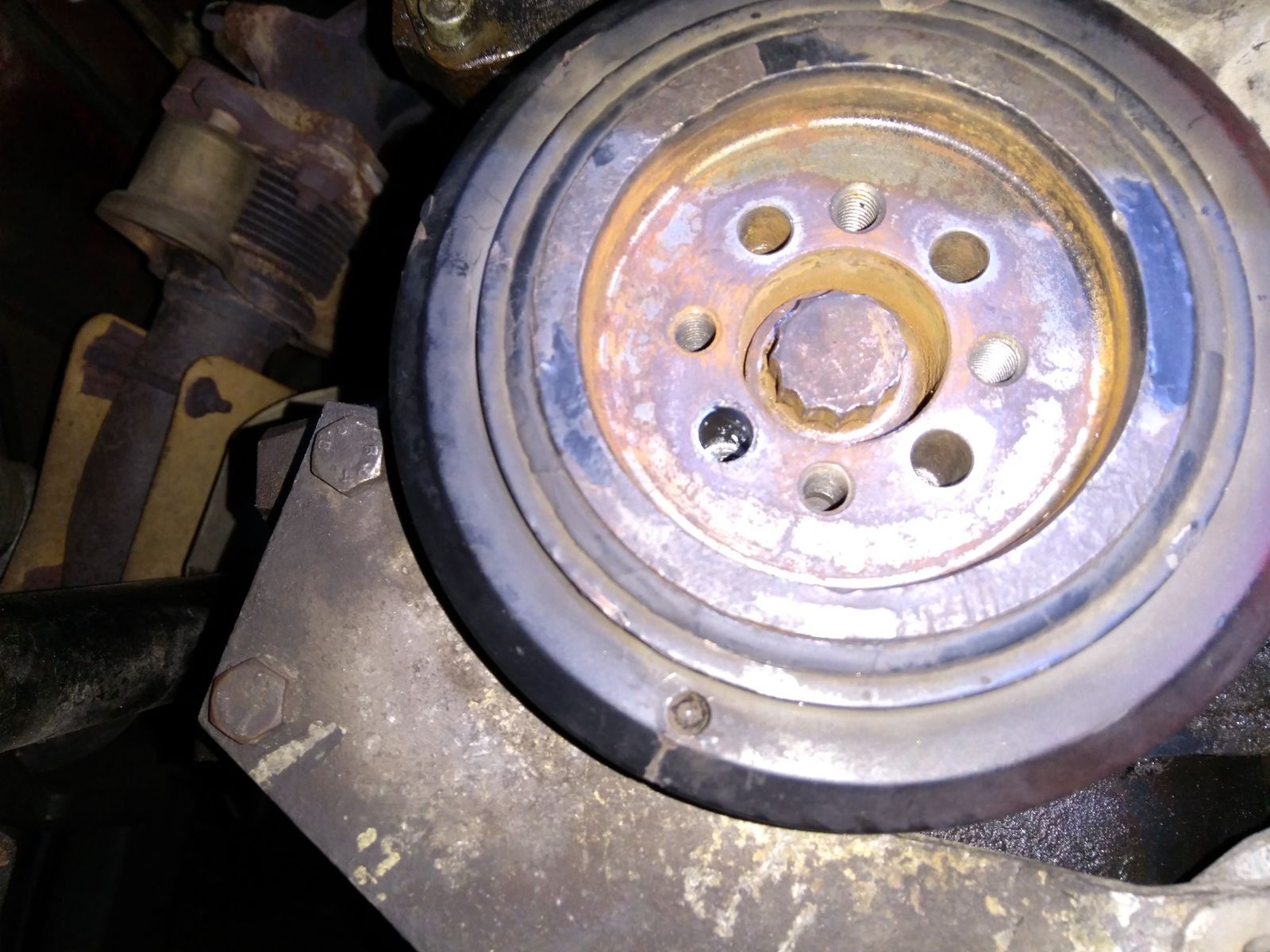 - Kurbelwellenriemenscheibe mit Zahnrad für den Zahnriemen auf die Welle aufgesetzt und mit der Schraube fixiert.