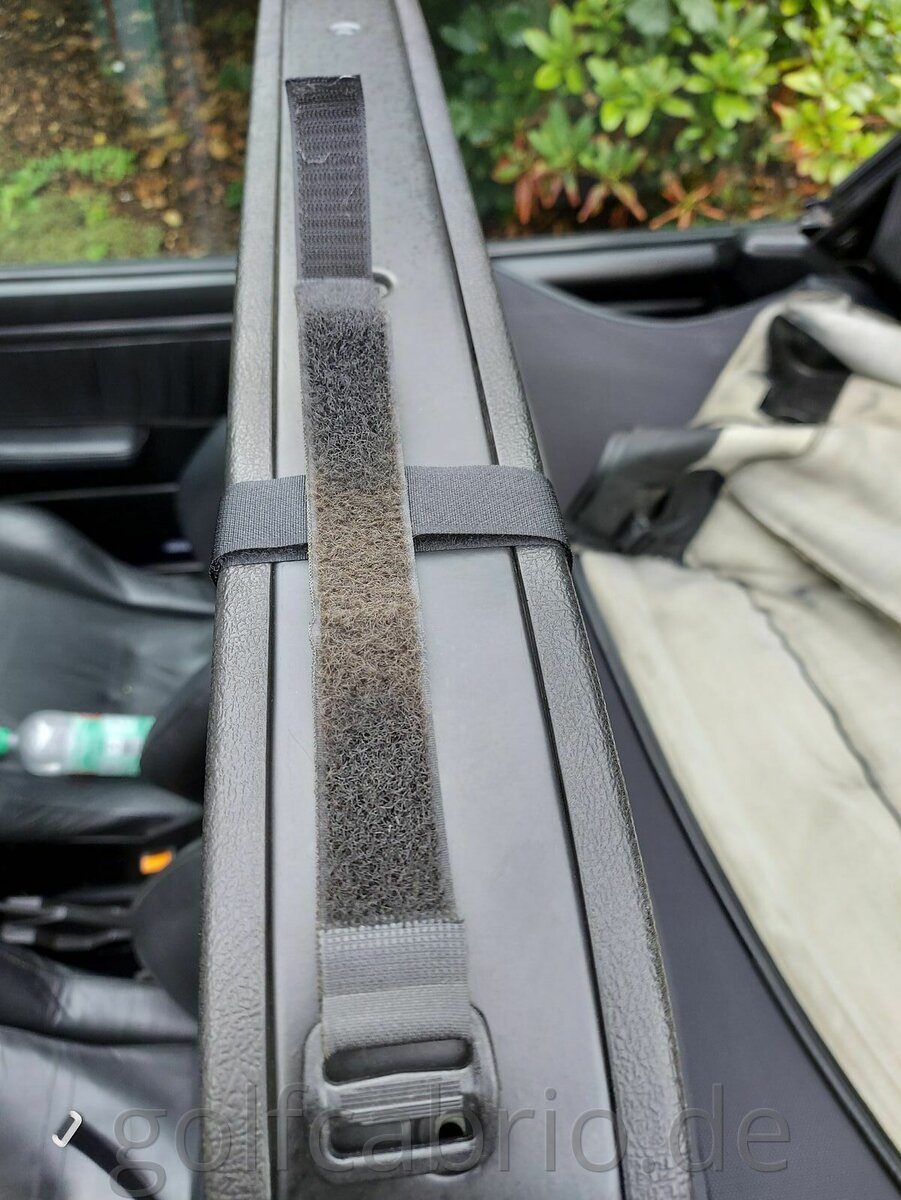 Am Teil der über die Rückenlehne geht sollten links und rechts Klettbänder sein. Die werden, wie die Persenning, unterhalb der Hutablage befestigt.