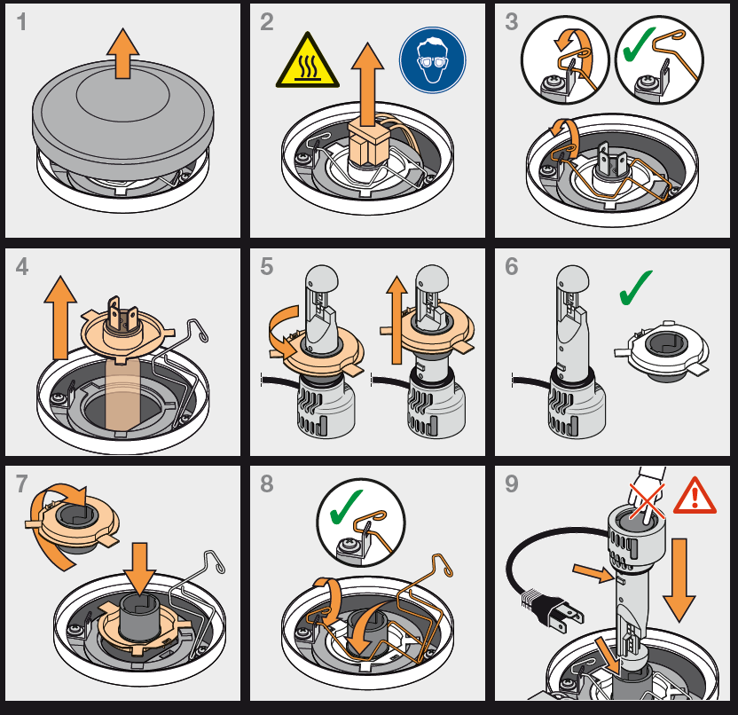 Den Fassungsring abnehmen und in die Funzel setzen. . Die Orig Dichtung innen passend rund ausschneiden und von vorn über die Lampe nach hinten zum Lüfter schieben. Dann die Lampe in den Bajonettverschluß eindrehen und die Gummikappe aussen herum wieder auf den Scheinwerfer drücken..... sollte einwandfrei klappen.