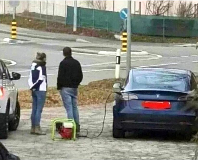 Wenn das Foto nicht gefakt ist, dann stehen die zwei mal locker 20 Stunden bis das Notstromaggregat die Batterie für die nächsten 100km geladen hat. Einer von beiden hat dann vermutlich einen großen Ersatzkanister dabei, der die dafür benötigten 30Liter Sprit beinhaltet.