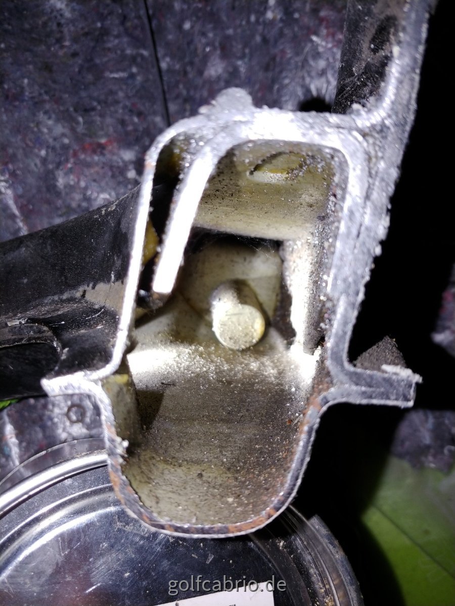 Desweiteren habe ich in den vorderen rechten Längsträger reingeschaut, bis runter zur Mutter der hinteren Querlenkerverschraubung: Kein Rost zu sehen, nirgends. Alles grau mit so ner fettigen Schicht drüber. Diese eingeschweißte Mutter ist zylindrisch und am Ende geschlossen. Da habe ich jetzt aber keine Bilder von gemacht.