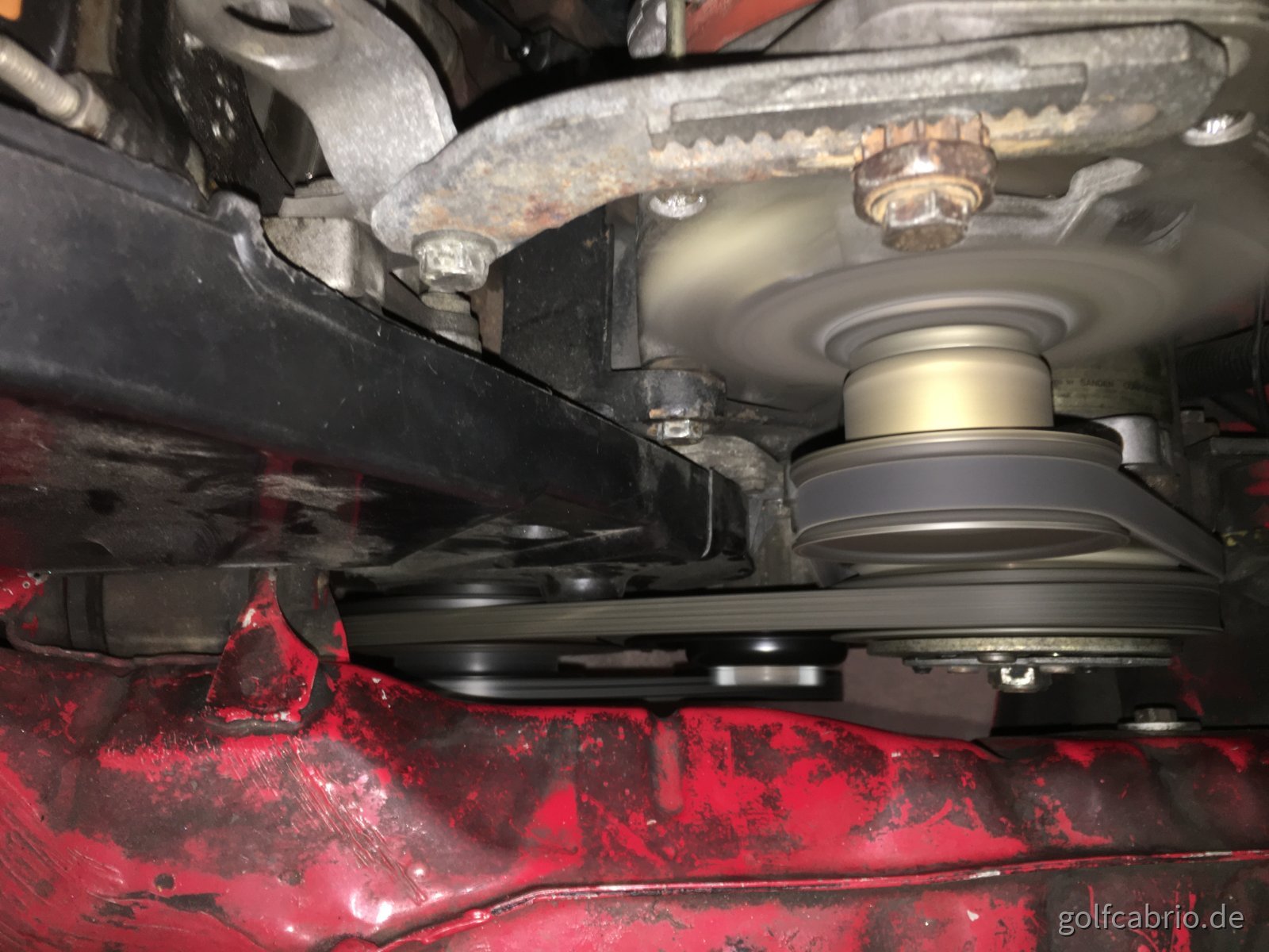 Bei Klimaanlage mit Sanden-Kompressor und Schwingungstilger-Kurbelwellenscheibe, Antrieb der Servopumpe ohne Umweg über die Wapu hat man nun also folgende Riemenscheiben:
