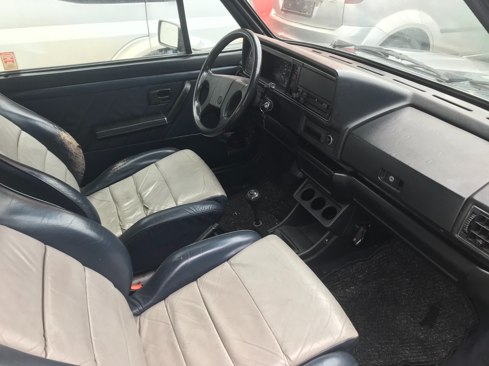 Die blau weißen Ledersitze für so ein Auto fand ich komisch und wollte mir eigentlich eine braune Innenausstattung zulegen. Durch einen blöden Zufall erfuhr ich dann aber, dass es sich bei dem Auto um einen Golf 1 Cabrio Azur mit der 1.8 112PS Maschine handelt. Zudem Zeitpunkt war mir klar, das Auto muss komplett neu und original aufgebaut werden.