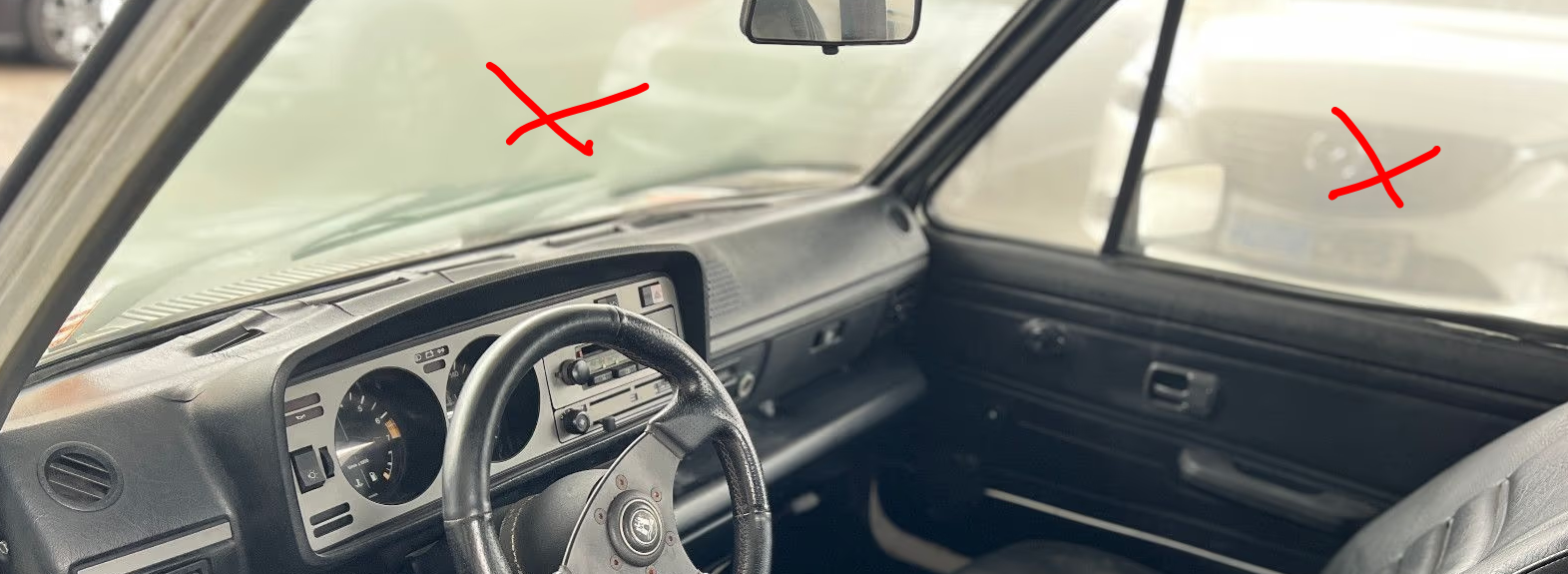 Das gepolsterte Armaturenbrett hat mehrere Risse und ist mittlerweile unansehnlich! Man könnte es durch ein hartes Armaturenbrett vom Golf 1 (BJ 1979/80) GTI ersetzen, welches evtl noch zu bekommen wäre.