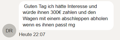 Der Höchstbietende für den Festpreis (VB=Vest-Breis) lag bei 350. Die habe ich doppelt drin wenn ich Scheinwerfer Rückleuchten Lenkrad Kat und Getriebe verkloppe...