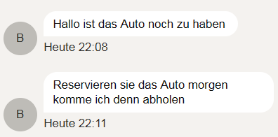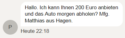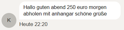 Habe geantwortet: "Vielen Dank für Ihre Anfrage. Bitte senden Sie mir schon mal Ausweisnummer, Name und Adresse zu damit ich den Kaufvertrag vorbereiten kann". Was dann kam läßt sich nicht in Worte fassen.