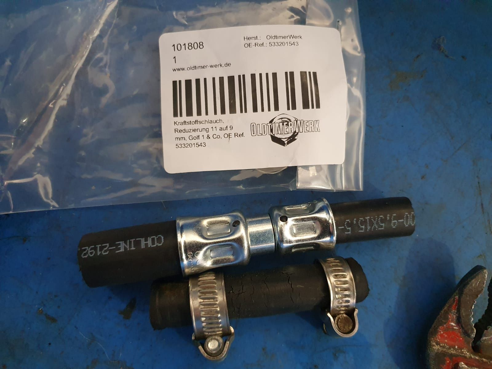 früher oder später wird uns alle das Problem ereilen, dass das Stück Benzinschlauch (Formschlauch eine Seite ID: 9mm andere Seite ID: 11mm) zwischen Rohrbogen und Benzinpumpe porös ist und getauscht werden muss.