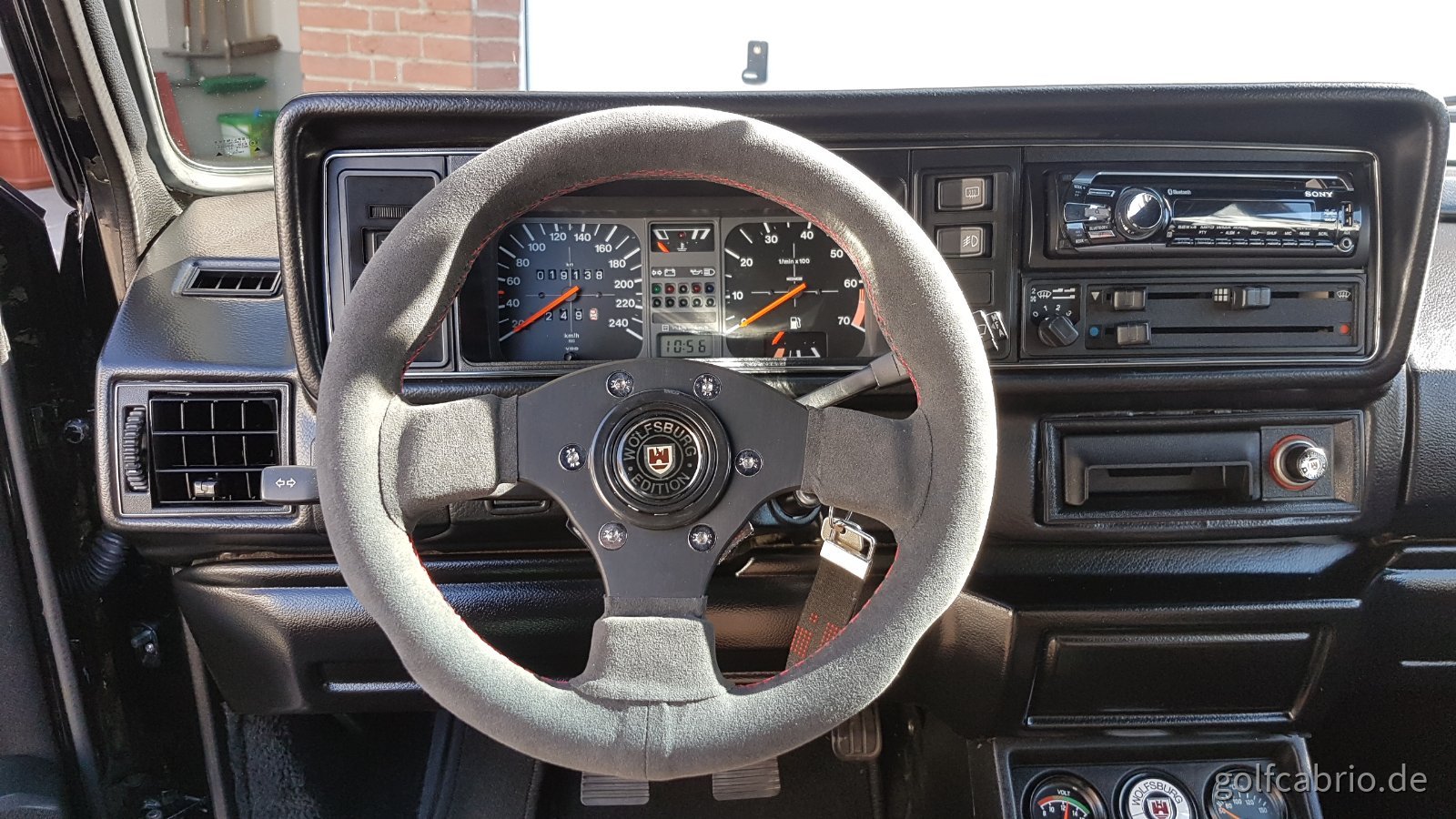 Freund ist Sattler und er hat mir mein original Lenkrad umgebaut. Neu Aufgeledert am Kranz um es so auch noch was dicker zu machen und Prallplatte/Hupenknopf auch mit Leder bezogen und die alte Struktur und VW Logo raus gearbeitet.
