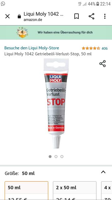 Seit ein paar Wochen verliert mein Getriebe etwas Öl. Komisch ist nur, dass es erst nach ca. eine Woche Standzeit ist. Wenn ich fahre passiert nichts, das Auto steht, es passiert immer noch nichts. Nach ca. einer Woche hab ich dann etwas Öl Verlust. Hat jemand schon einmal -Liqui Moly Getriebe-Öl-Verlust-Stop 50 ml tube 1042 - probiert? Oder muss ich die ganze Dichtung tauschen? Ich würde mich freuen, wenn wir der ein oder andere ein paar Tipps geben könnte.