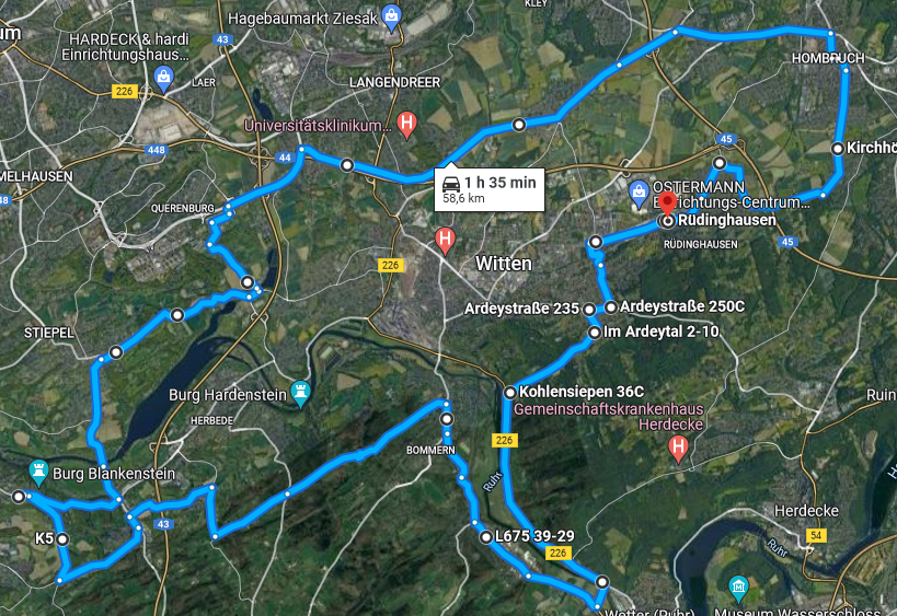 Unten im Tal an der ARAL-Tankstelle links abbiegen auf die Kemnade(r) Straße