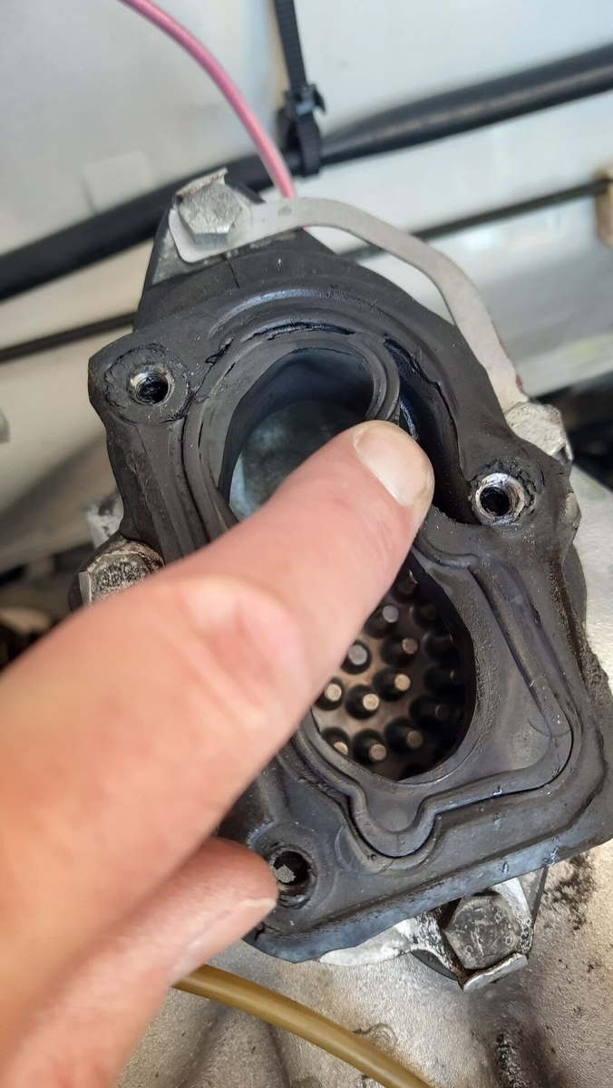 Vergaserflansch V2, die vor wenigen Jahren erneuerte Vergaserflanschdichtung war nur noch Schrott. Nun sitzt dort ein original Pierburg Teil.
