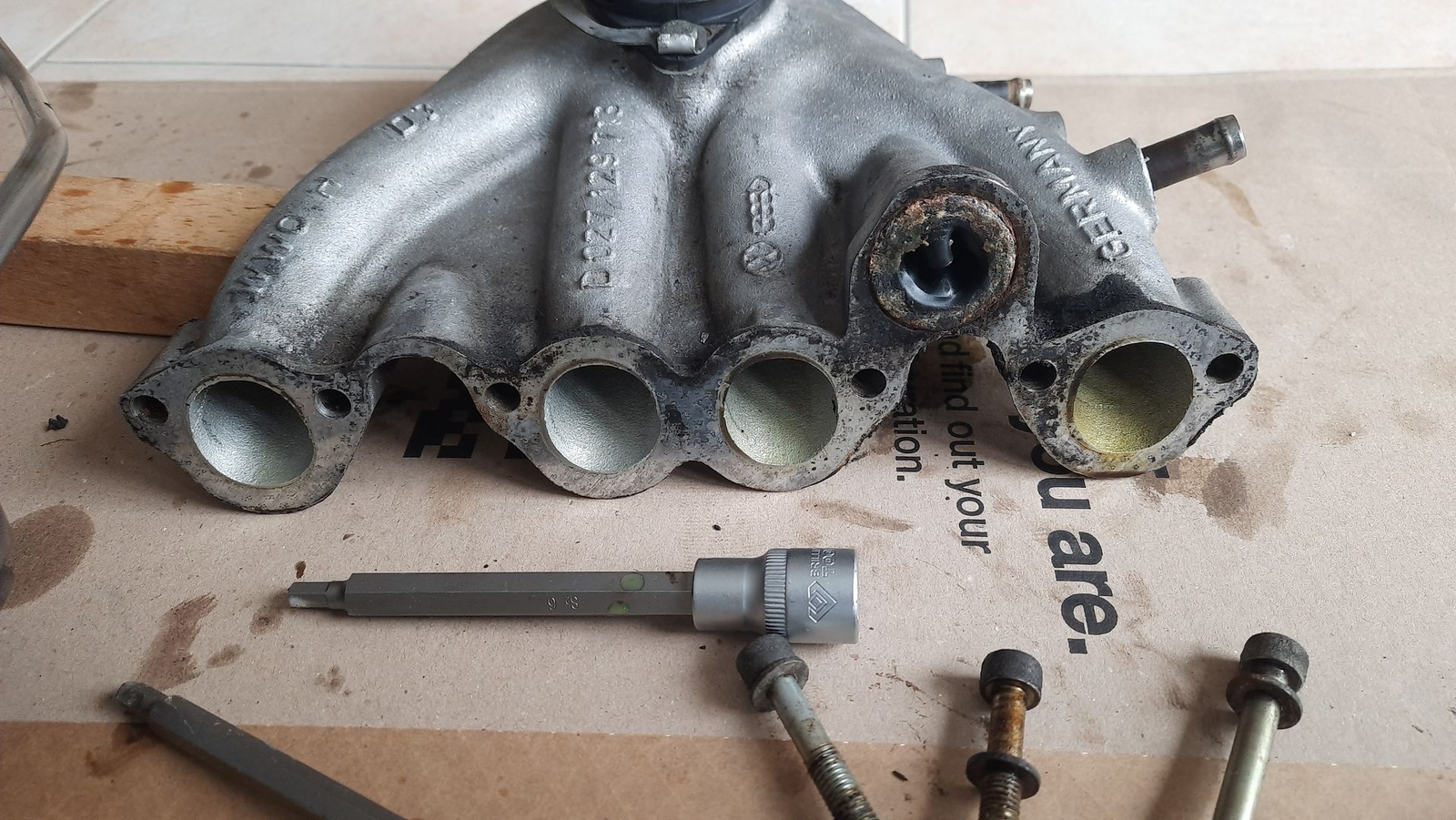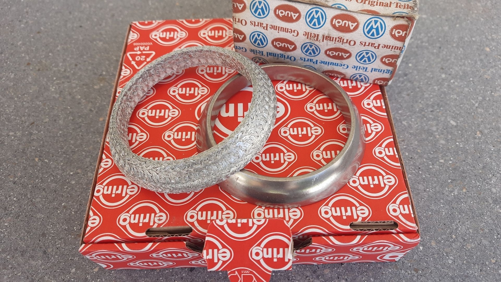 Die ungeschraubten Auspuffklammern könnten auch mal neu. Bei der Gelegenheit konnte ich noch einen originalen VW Satz auftreiben, diesen Drahtgeflechtring hätte ich gar niemals reingesetzt.