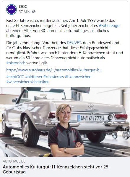 Liebes Clubmitglied, das H- Kennzeichen feiert nächstes Jahr sein 25jähriges Jubiläum. Auf seiner Facebookseite https://www.facebook.com/OCC.Assekuradeur/ betont der OCC ganz besonders die Vorarbeit, die der DEUVET für diesen Erfolg geleistet hat.