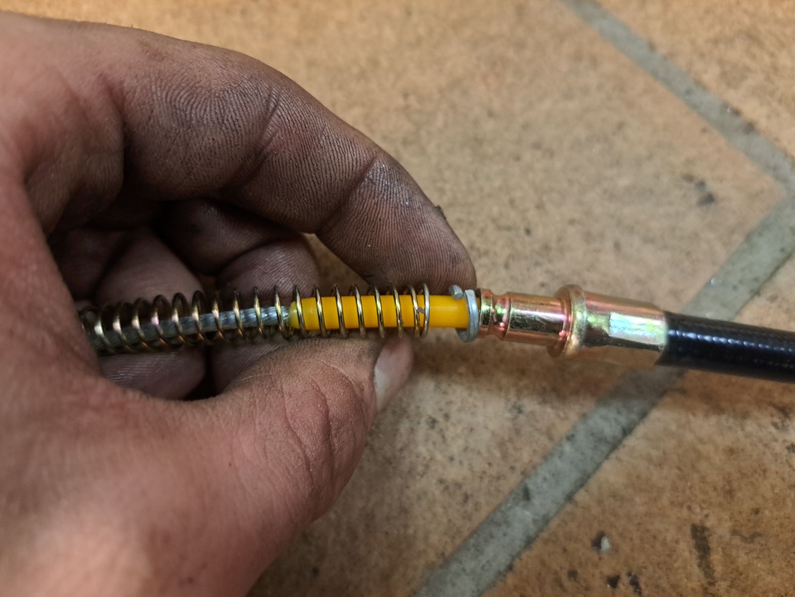 Also ich würde sagen, der ist eigentlich dafür da, das gelbe Röhrchen im eingebauten Zustand innerhalb der Hülle zu halten. Dafür und für's Durchfädeln scheint er nicht eng genug zusammengedrückt zu sein. Allerdings muss das Drahtseil da noch durchgehen und die Feder sich abstützen. Sieht dann so aus: