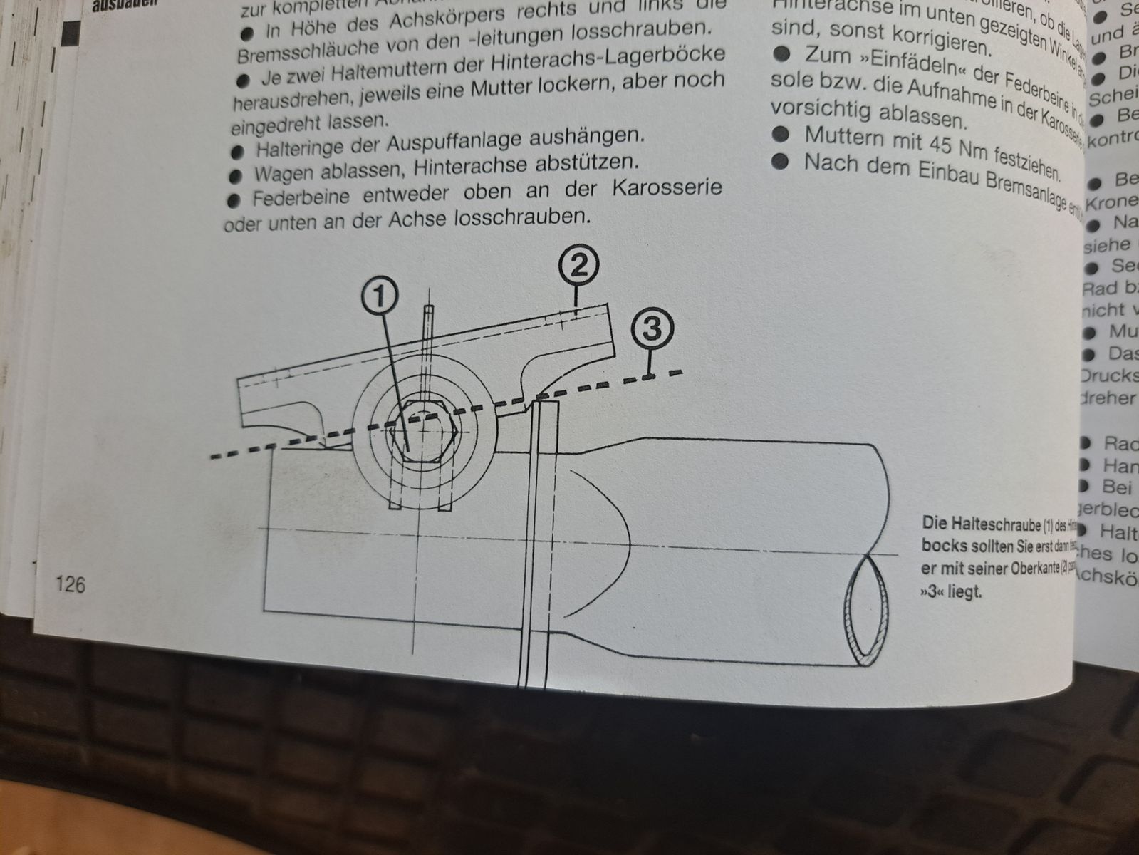 Erst die Schraube Lagerbock-Achse (ich meine mit 15% "Schräge", steht auch im Schrauberbuch) und dann die HA an die Karosse setzen und verschrauben.