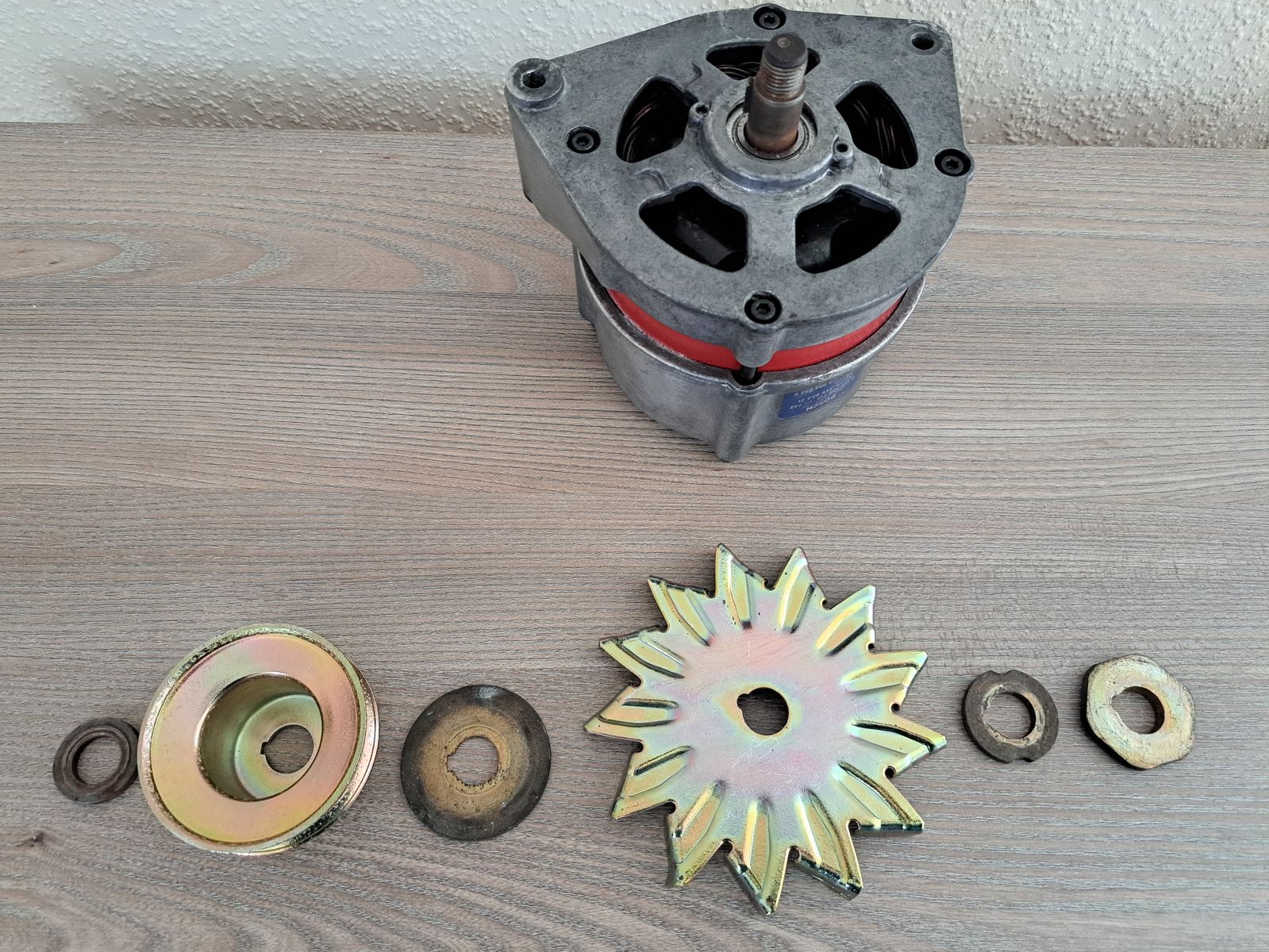 Die Scheibe ganz oben kommt in die Riemenscheibe unter die Mutter als Unterlegscheibe.