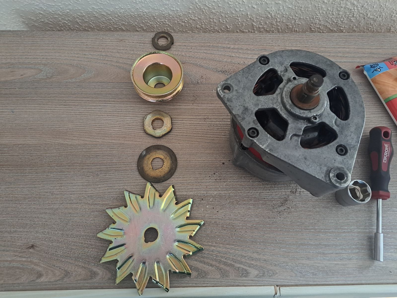 Die Scheibe ganz oben kommt in die Riemenscheibe unter die Mutter als Unterlegscheibe.