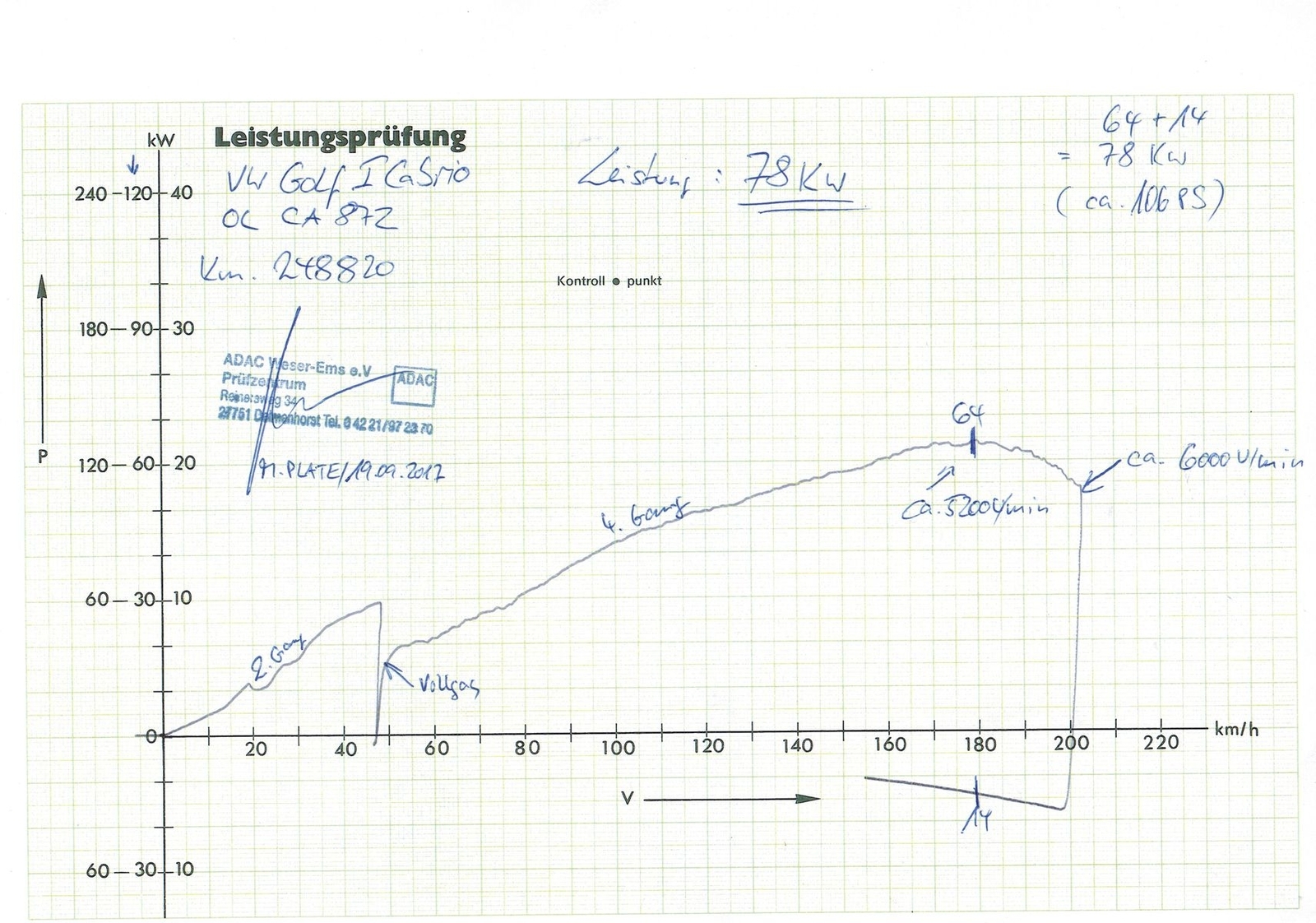 • Ich hatte damals mit Thyssen-Chip, 8°, 98 Oktan und sonst alles Serie, aber auch in gutem Zustand und richtig eingestellt folgende Leistung auf einem ollen ADAC Prüfstand. Serie wird er also wohl mindestens das haben, was er haben soll.