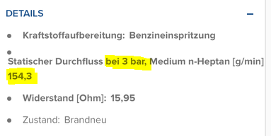 Die verbauten Düsen werden niemals 100% getaktet mit dem originalen Kennfeld, also weshalb genau sollen die 160g Düsen am Limit sein? Oder geht es darum, dass in kürzerer Taktung die gleiche Menge Sprit reinkommt? Da wir aber Saugrohreinspritzung fahren, dürfte auch das höchstens theoretisch einen Unterschied machen - und auch nur bei Teillast. Bei Volllast müsste der Motor mit grösseren Düsen theoretisch überfetten.