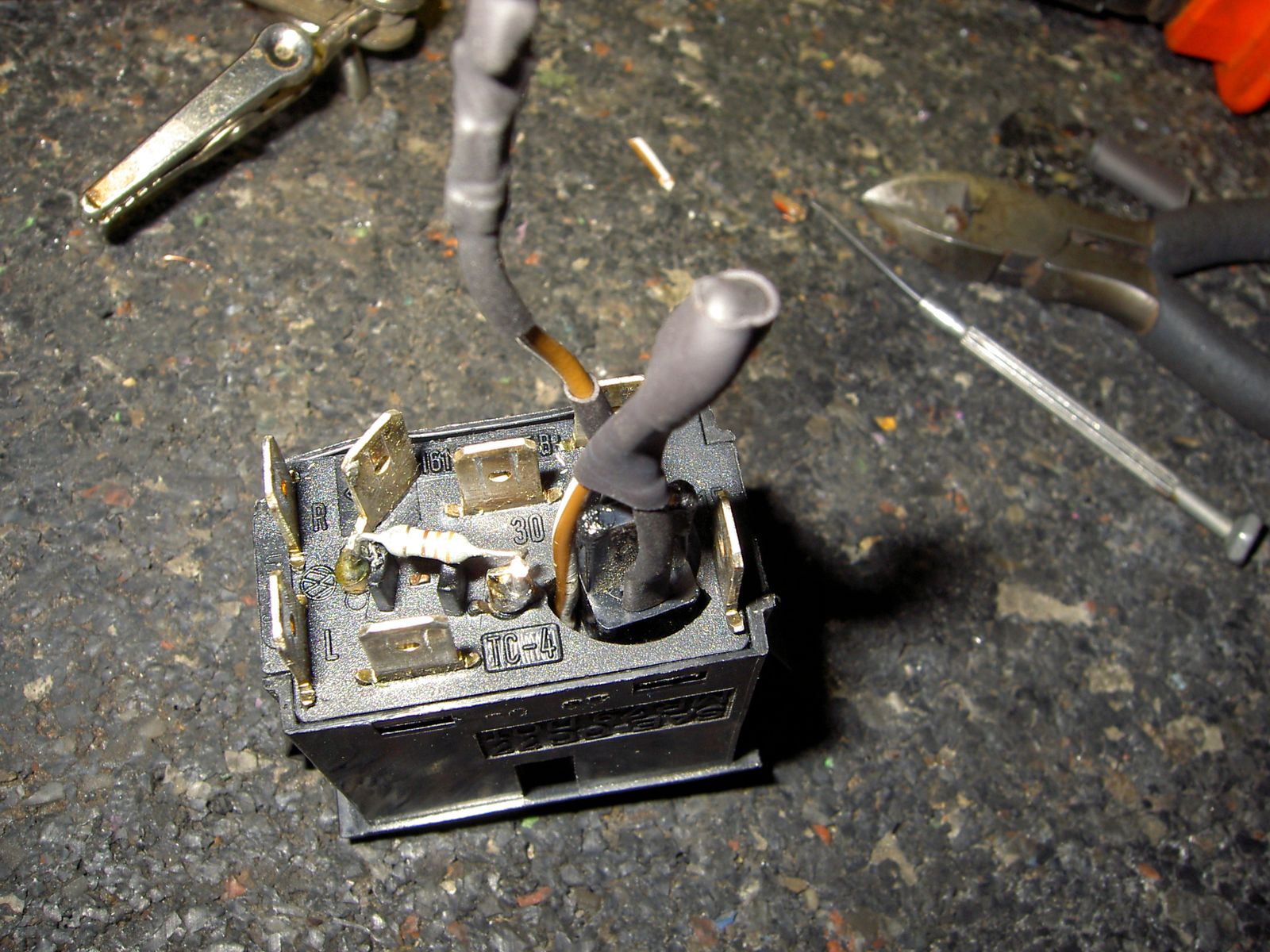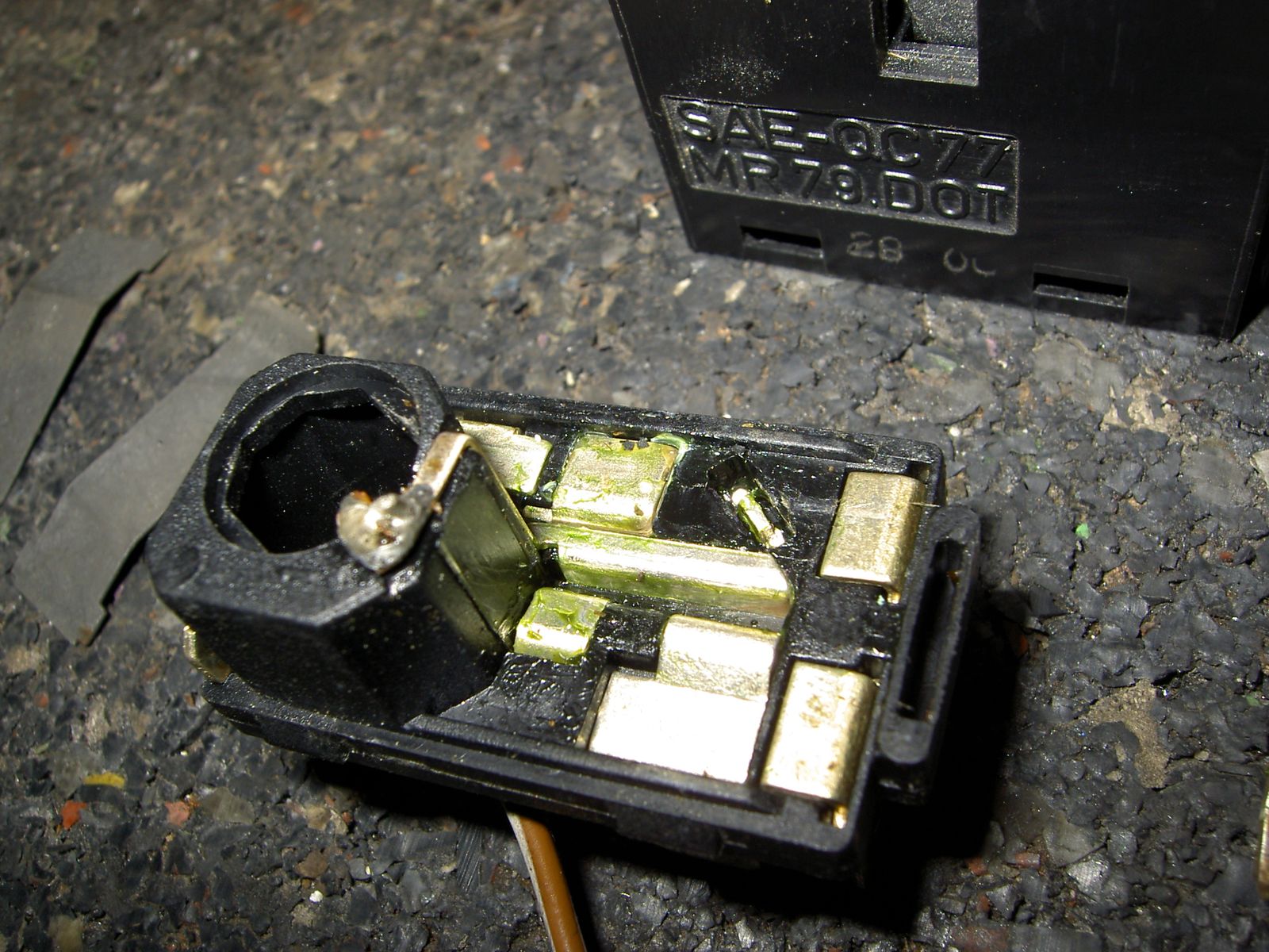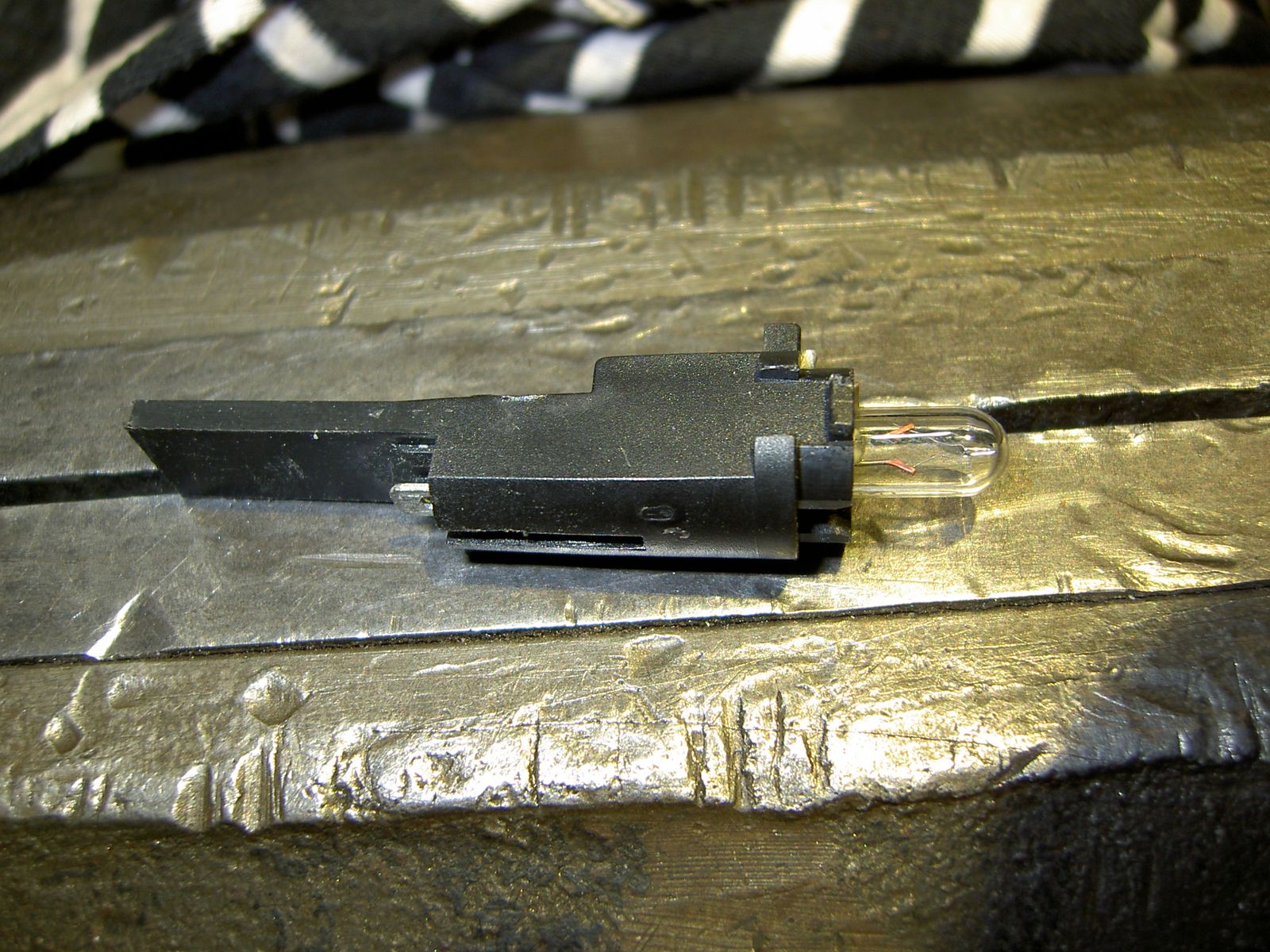 Ich holte mir also das Plus direkt von diesem kleinen Zapfen IM Schalter (in den die Bajonettlampe normal eingeschoben wird und dort durch die 90°-Drehung Kontakt bekommt) in dem ich den Schalter zerlegte, genau an dem besagten Zapfen ein Kabel dranlötete und nach draußen führte - im Lampenschacht ist Platz genug: