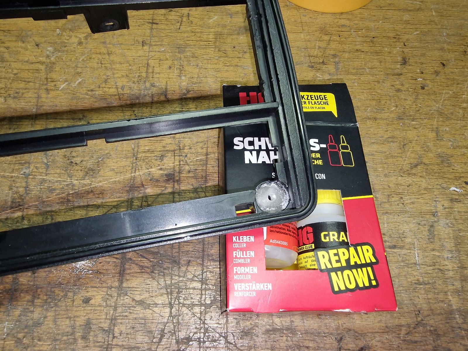 Der Rahmen hat es auch mehr oder weniger hinter sich. Provisorisch mit einer unterlagscheibe geholfen.