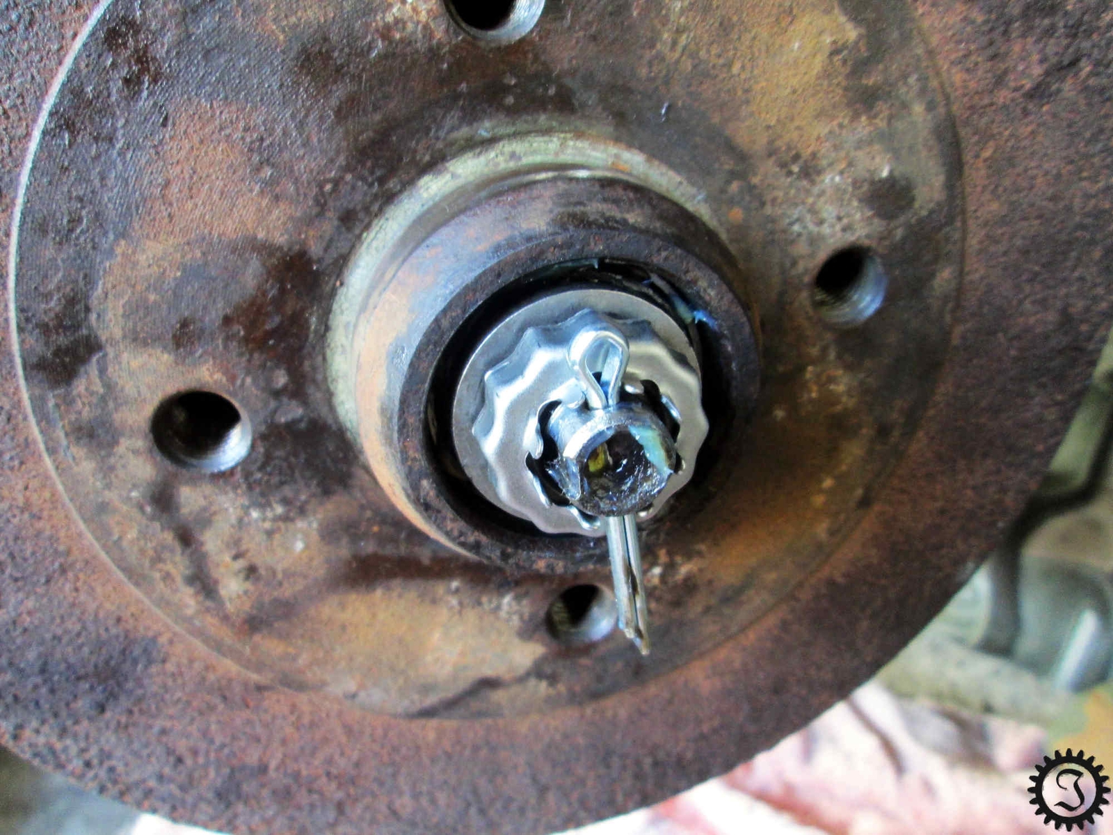4. Zieh die Kronensicherung ab, darunter ist eine M16 Mutter, mit der das Radlagerspiel eingestellt wird. Dazu brauchst die eine 24er Nuss.