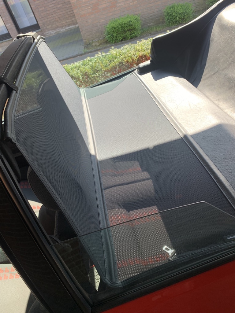 Der Einbau ist sehr einfach und es sitzt fest und stramm in Ihrem Cabrio. Oben am Überrollbügel wird das Windschott mit Druckknöpfen befestigt und bei der Montage verändern Sie nichts an Ihrem wertvollen Cabrio! Löst man die Druckknöpfe, gleitet der senkrechte Teil des Windschotts nach unten. Der waagrechte Teil bleibt jedoch fest. Sie können die Rücksitzbank als Stauraum verwenden (sehr nützlich bei Urlaubsfahrten). Für den Ausbau sind nur ein paar wenige Handgriffe nötig und es lässt sich dann einfach zusammenrollen. Das Dach Ihres Fahrzeuges kann bei eingebautem Windschott geschlossen werden.