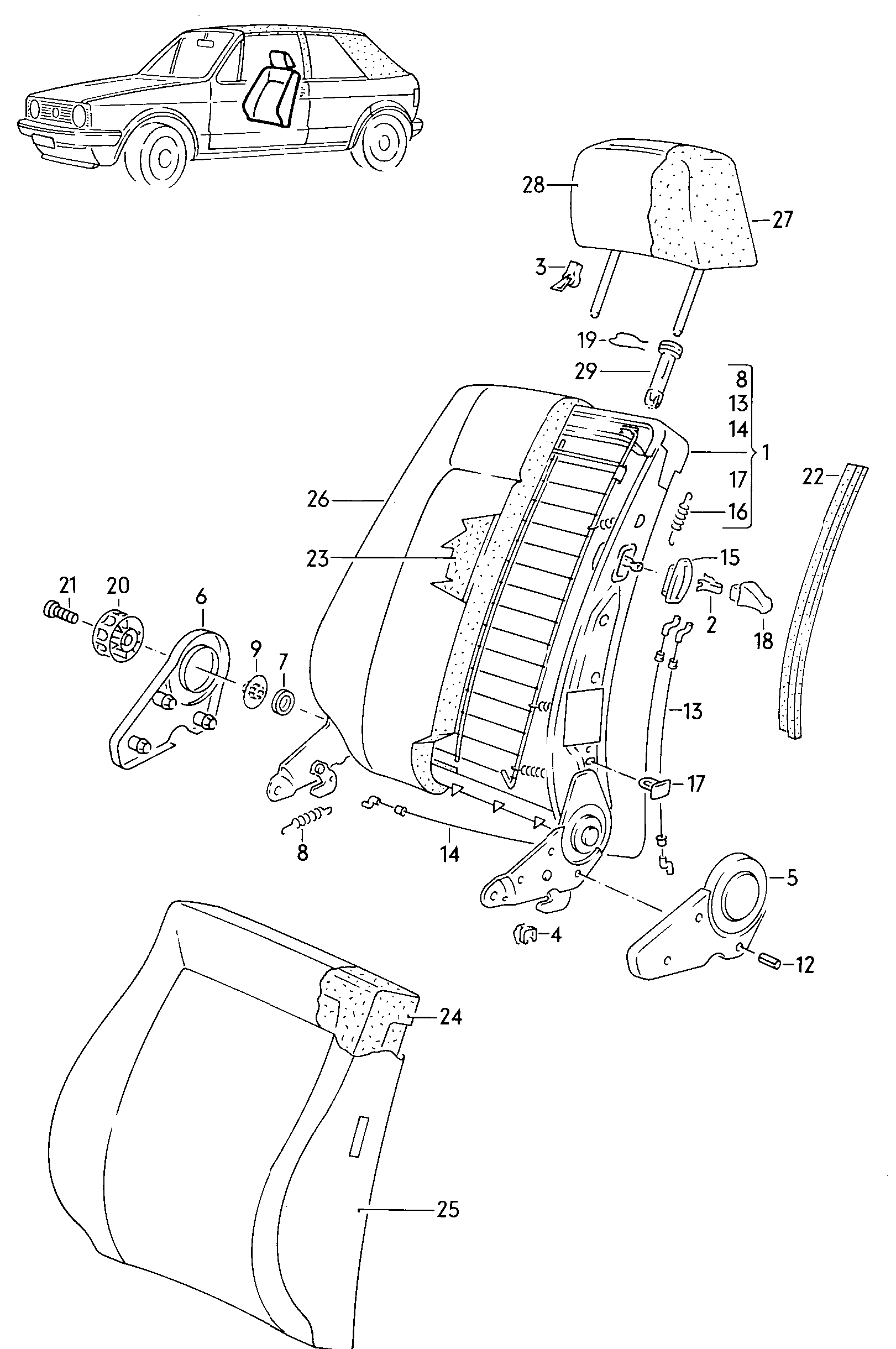 Sicherung an Aufnahme der Rückenlehne auf dem Sitzgestell