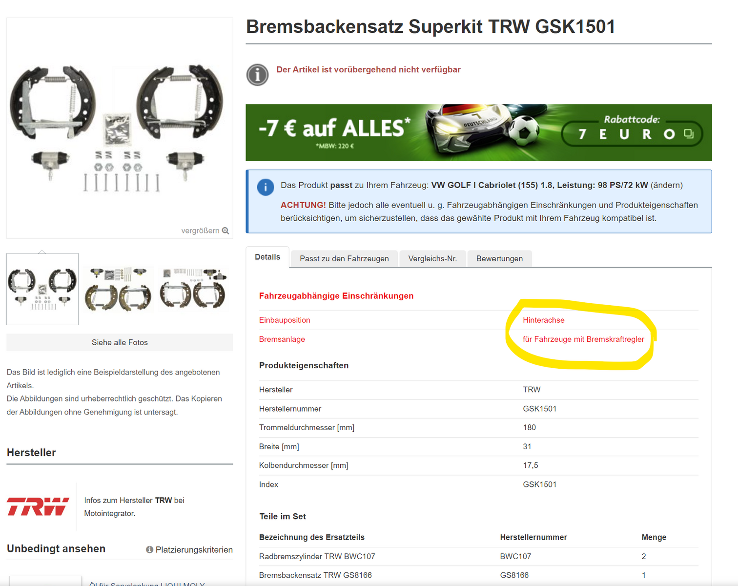 Mir ging es nur um das passende Bremsenkit. TRW bietet GSK1500 und GSK1501 an. Ersteres ist für Fahrzeuge ohne Bremskraftregler und zweites für Fahrzeuge mit Bremskraftreglern.