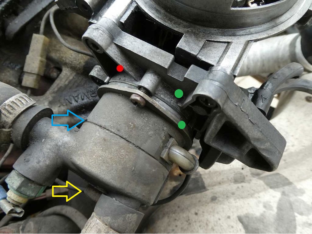 Letztens einem mit dem 1B3 geholfen, der hatte die zweite Markierung auch nicht gefunden. Dort sind diese Markierungen 1mm dick und so 3mm lang. Im Foto bei den zwei grünen Punkten. Vielleicht findest Du doch beide bei Dir, müssen ja da sein. Schau noch mal, vielleicht hilft das Foto vom neueren Vergaser ja etwas.