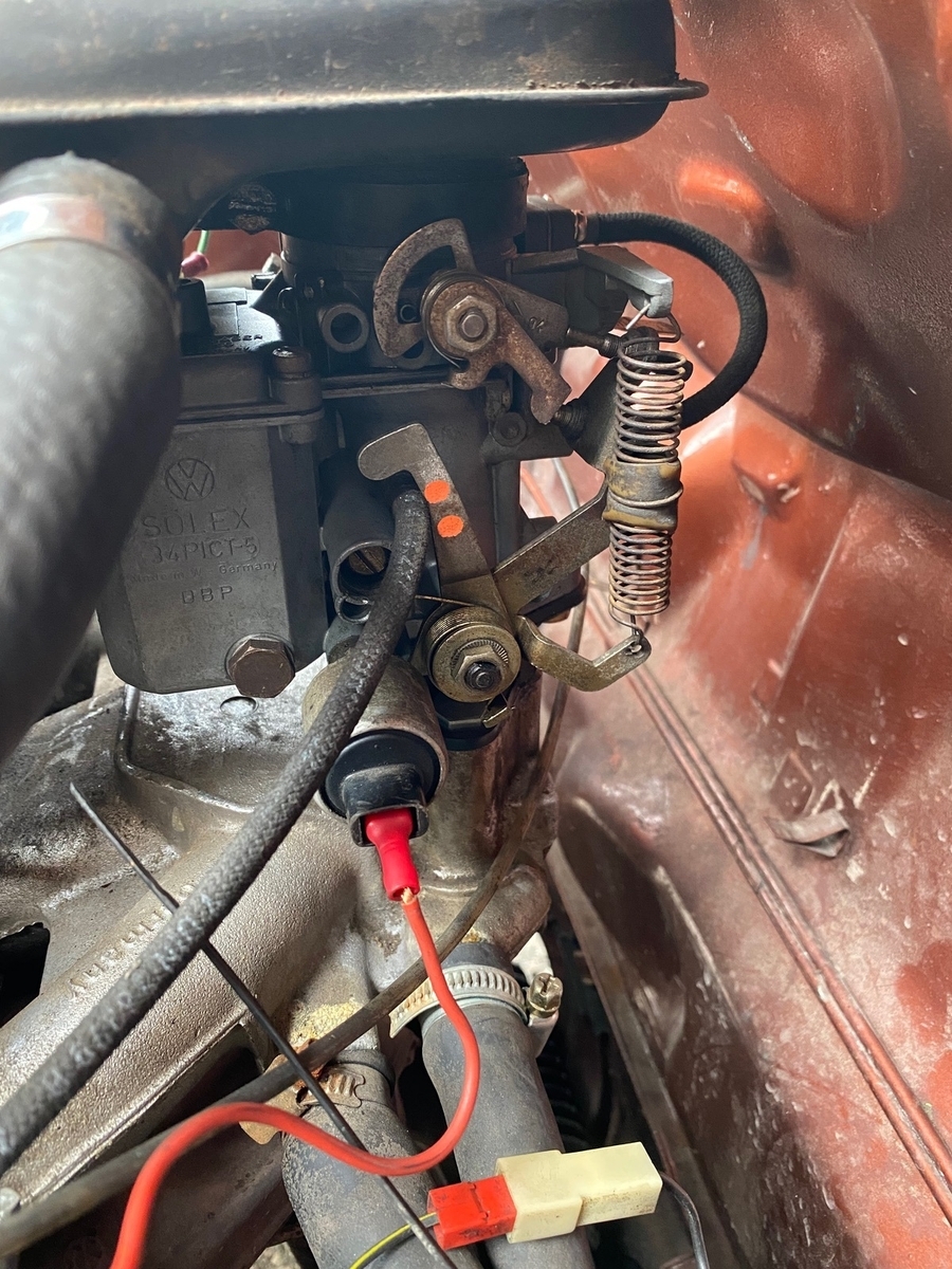 Na immerhin hat er jetzt neue Zündkerzen, ne neue Dichtung am Ansaugrohr, neue Teile beim Zündverteiler, der Vergaser ist überholt, er ist geputzt. Jetzt fehlt nur noch der TÜV.