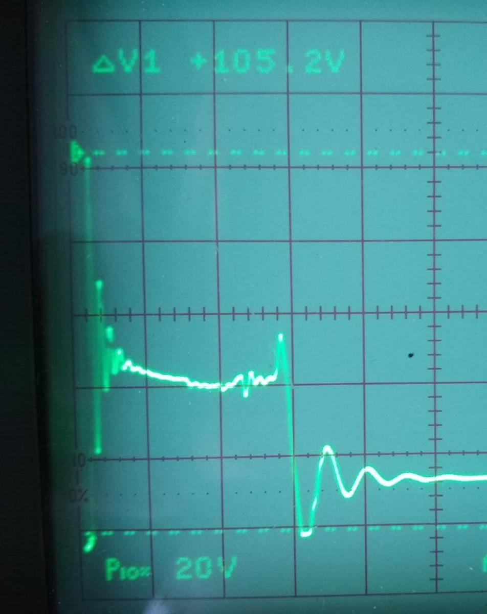 Beim Signal kommt erstmal eine 100V Spitze, danach fällt es auf etwa 30V ab. Und schwingt dann auf 12-15V aus.