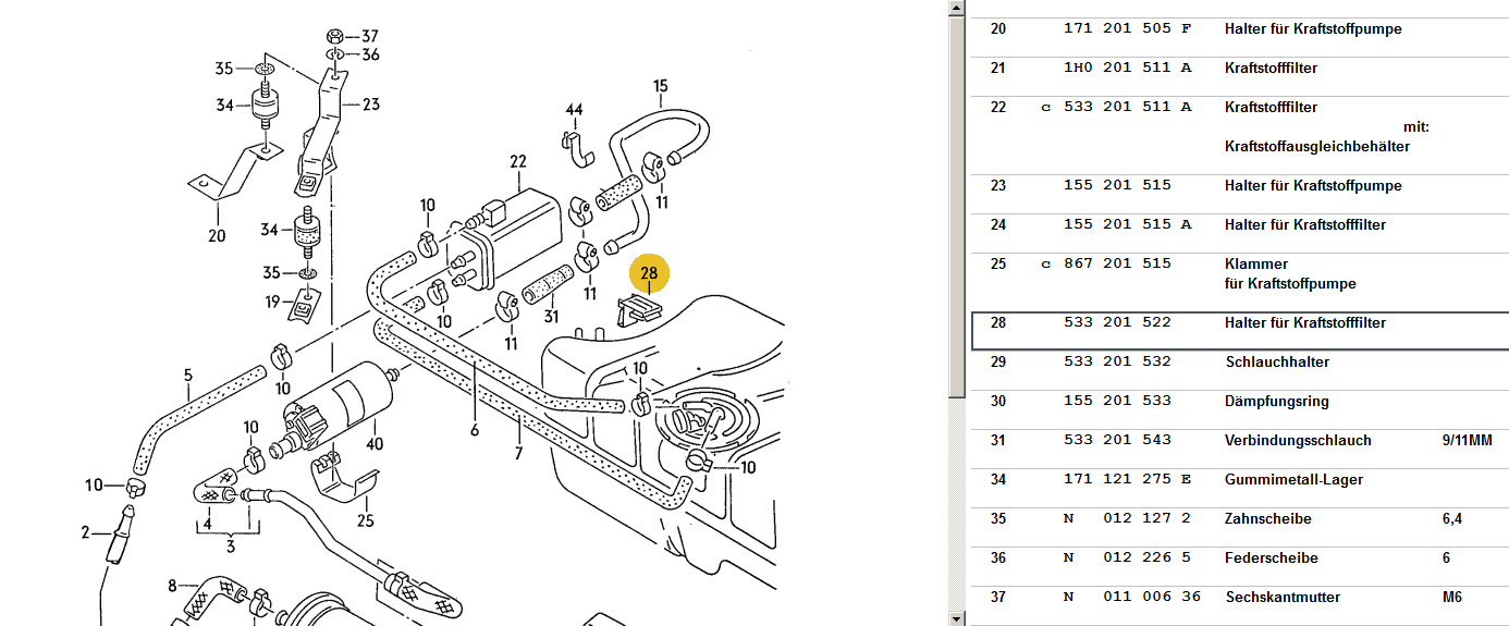 accumulator; fuel filter; fuel pump; fuel pipe; F ... Scirocco (SCI) 1988 year Volkswagen USA 69020