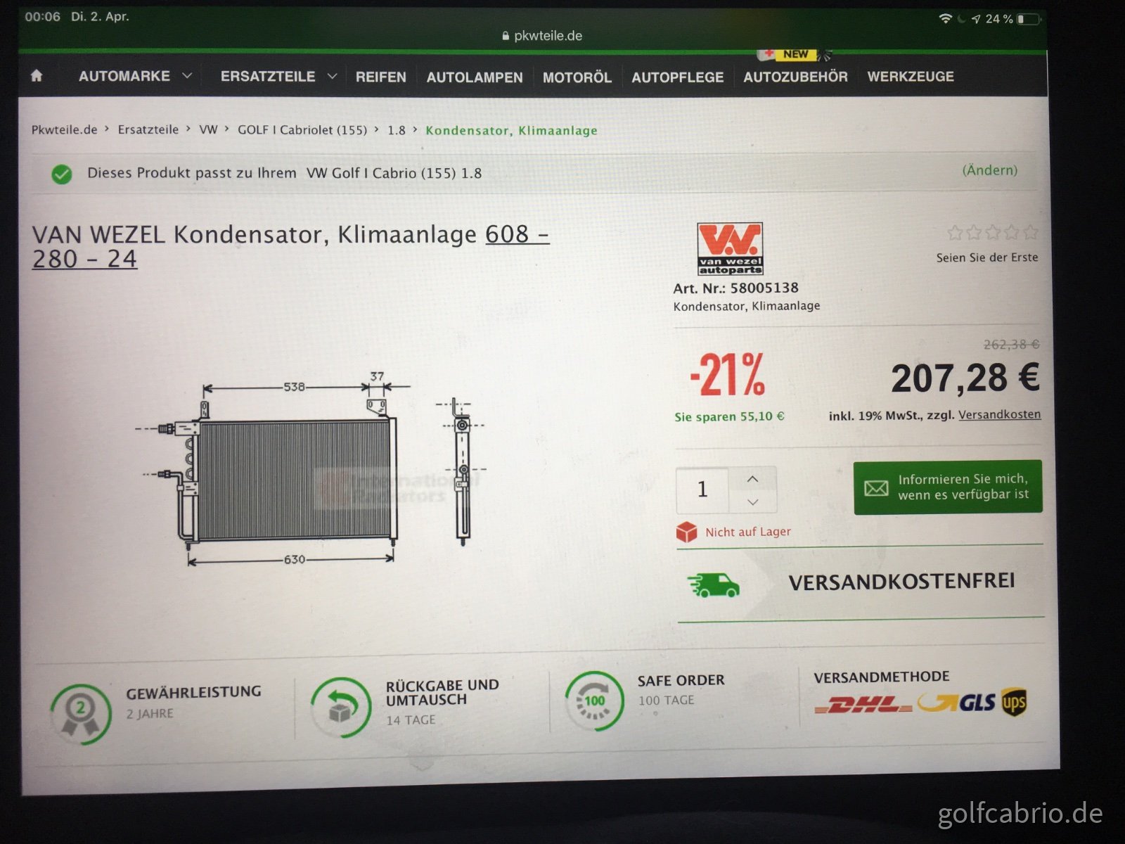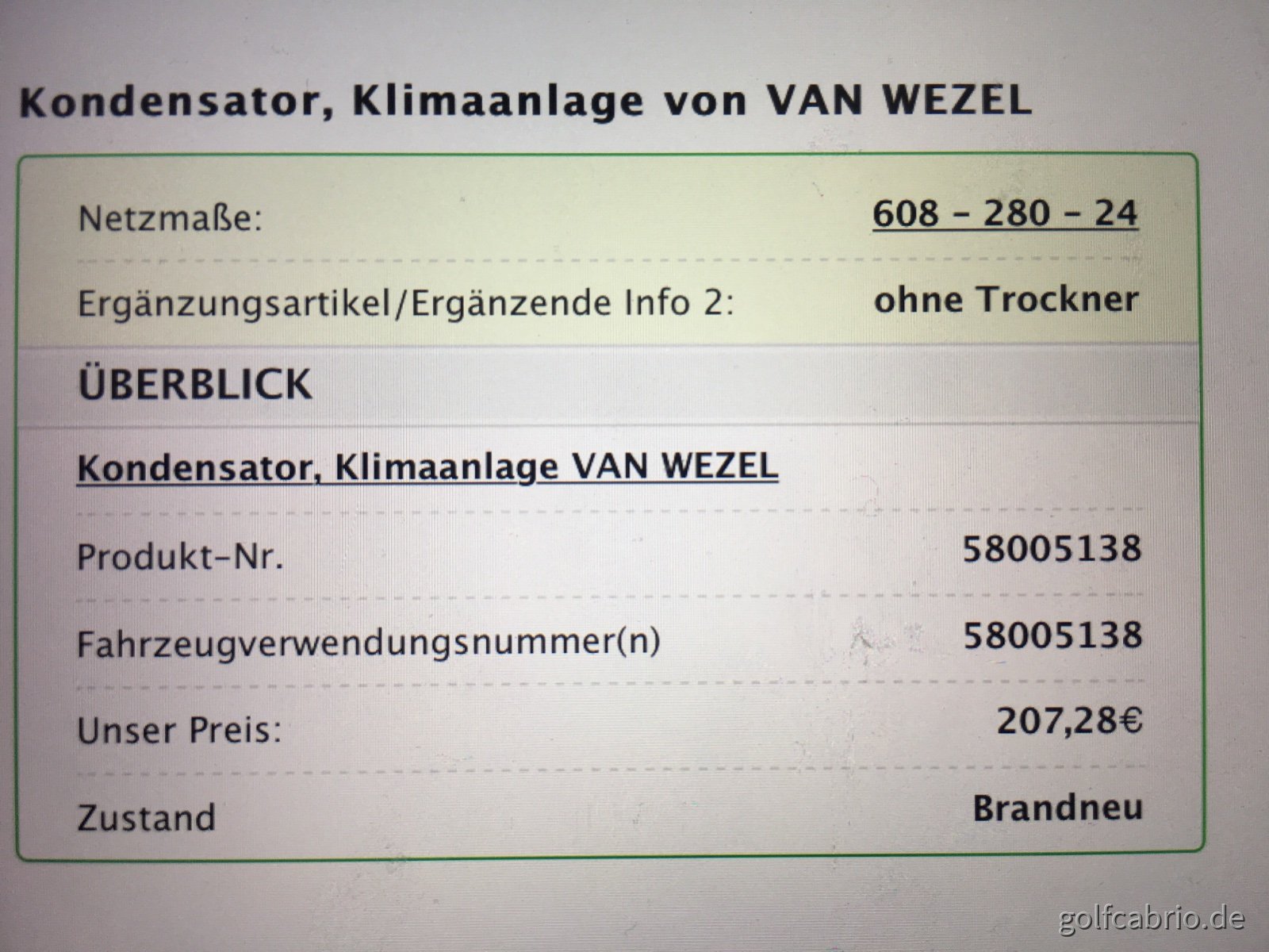 Es wird auch sicherlich kein Hersteller einen so alten Kondensator für ein über 30 Jahre altes Auto herstellen, welche auch noch für R12 ausgelegt, Klar man kann auch R134a Einfüllen ohne Probleme oder auch Propan,