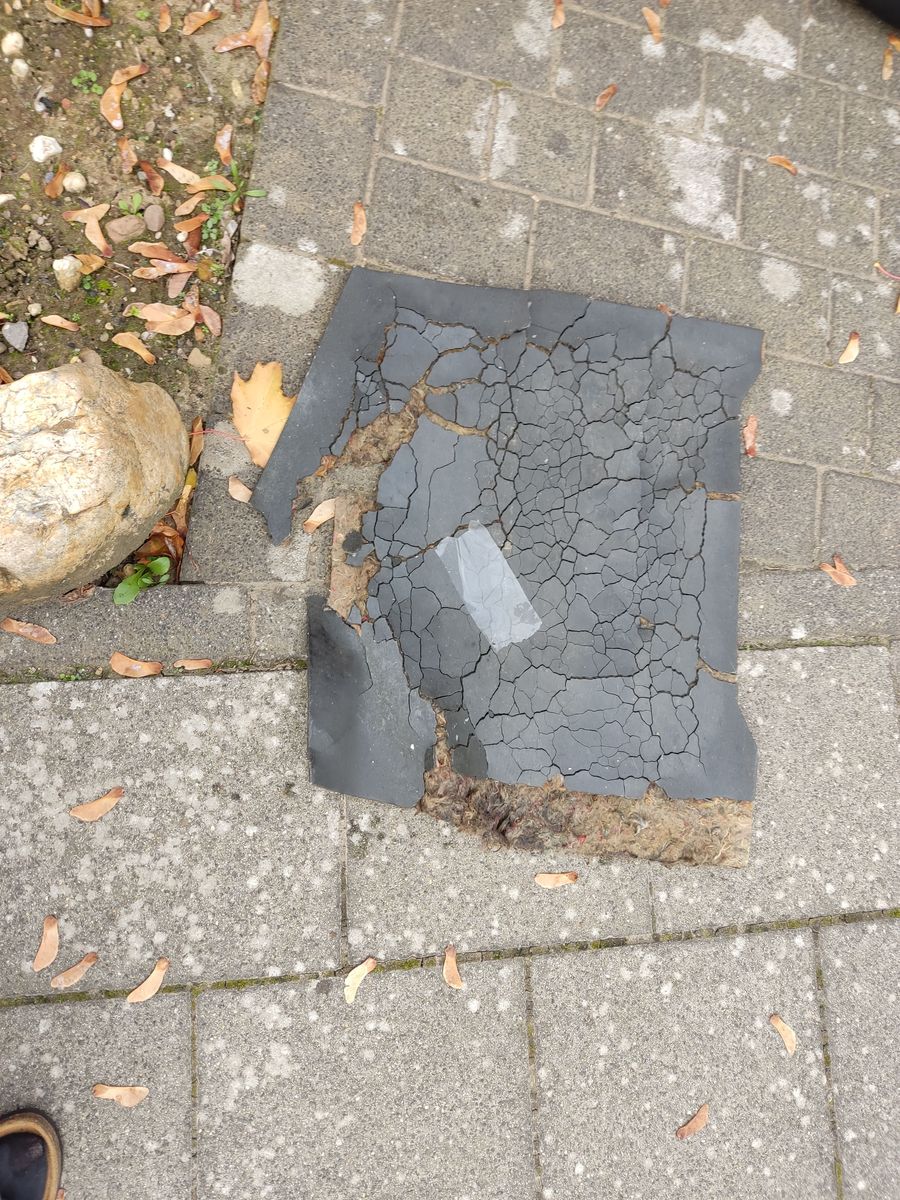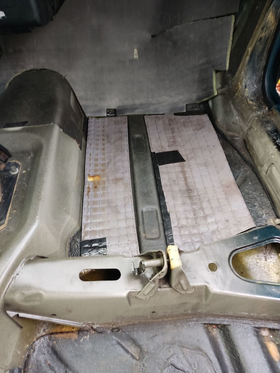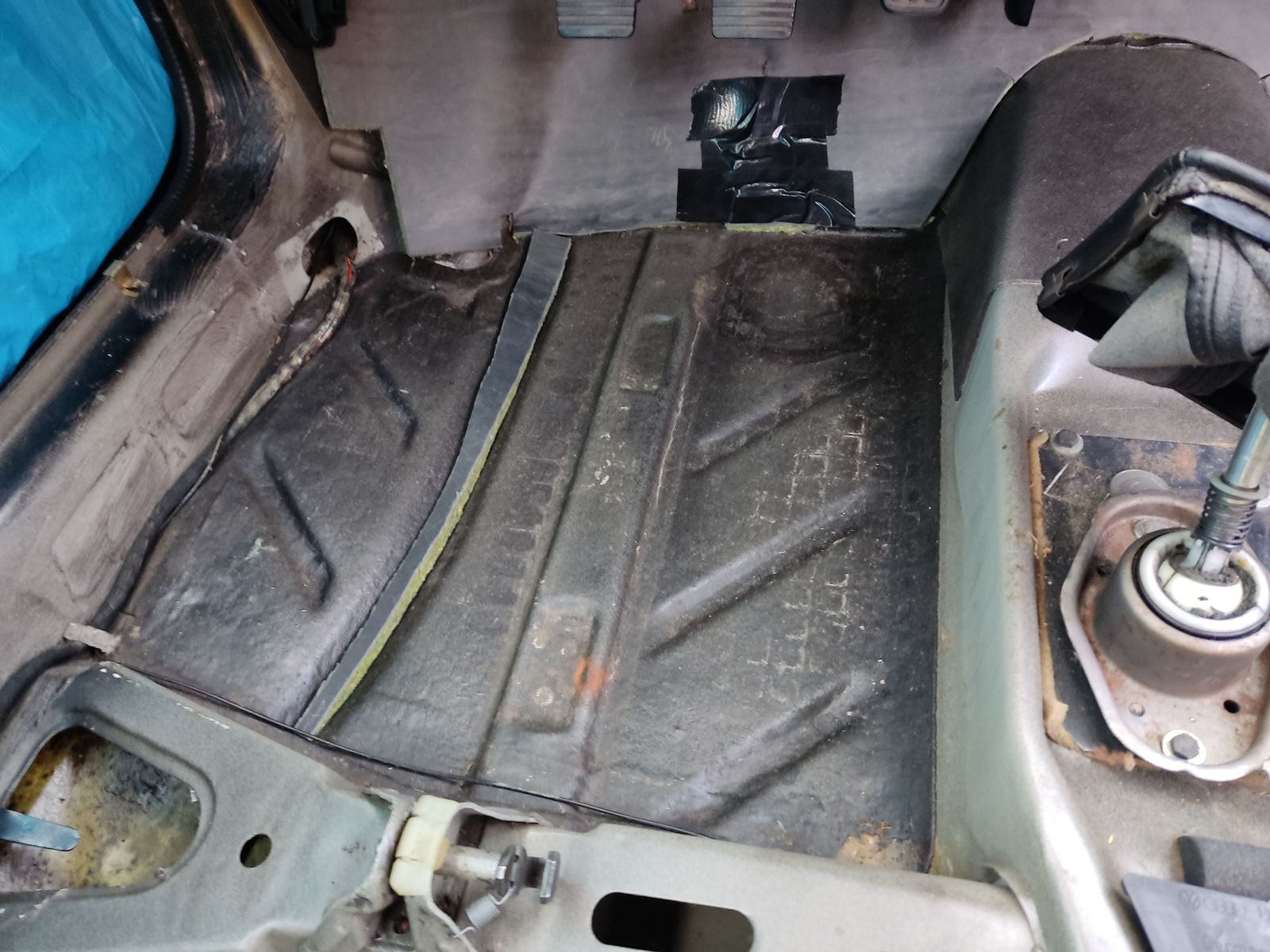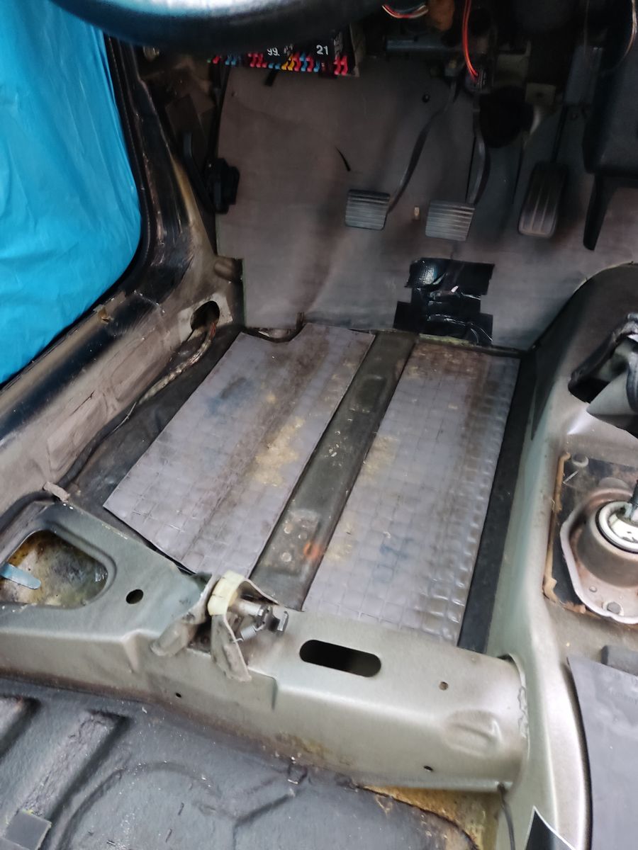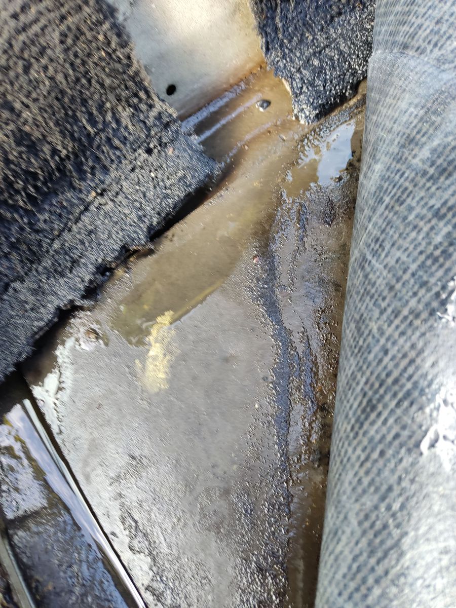 Nachdem wir gestern noch etwas Wasser ausgeschüppt haben, endete die heutige Tat mit nackigem Fußraum. Das Dämmmaterial ist Schrott.