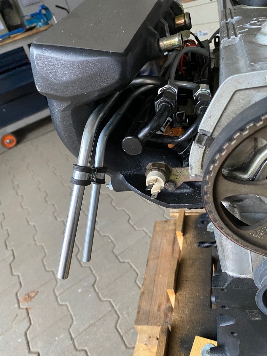 Es einknickt. Aktuell sind die Rohre noch bissl lang. Werden dann im eingebauten Zustand gekürzt wenn ich weis wie viel „Luft“ die Schläuche haben. Muss ja bedacht werden das der Motor sich im Betrieb auch neigt.