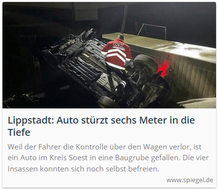 Lippstadt: Auto stürzt sechs Meter in die TiefeWeil der Fahrer die Kontrolle über den Wagen verlor, ist ein Auto im Kreis Soest in eine Baugrube gefallen. Die vier Insassen konnten sich noch selbst befreien.www.spiegel.deKEINER VON DENEN IST BEI DIESEM FILMREIFEN STUNT TÖDLICH VERUNGLÜCKT !