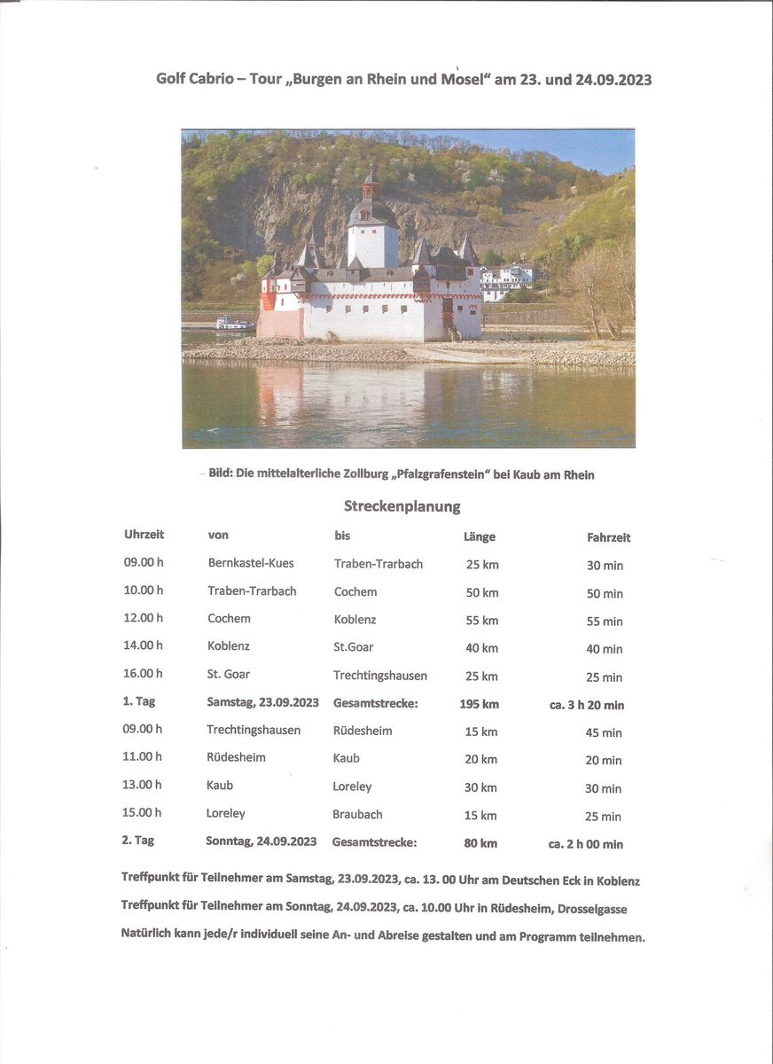Schöne Grüße vom halb Golf Fahrer (Harald und Alex) sie würden gerne in sankt Goarshausenhausen oder sankt Goar am Fähranleger zu euch stoßen. Sagt bitte Bescheid wann ihr wo vorbei kommt und wann grüß Ralf