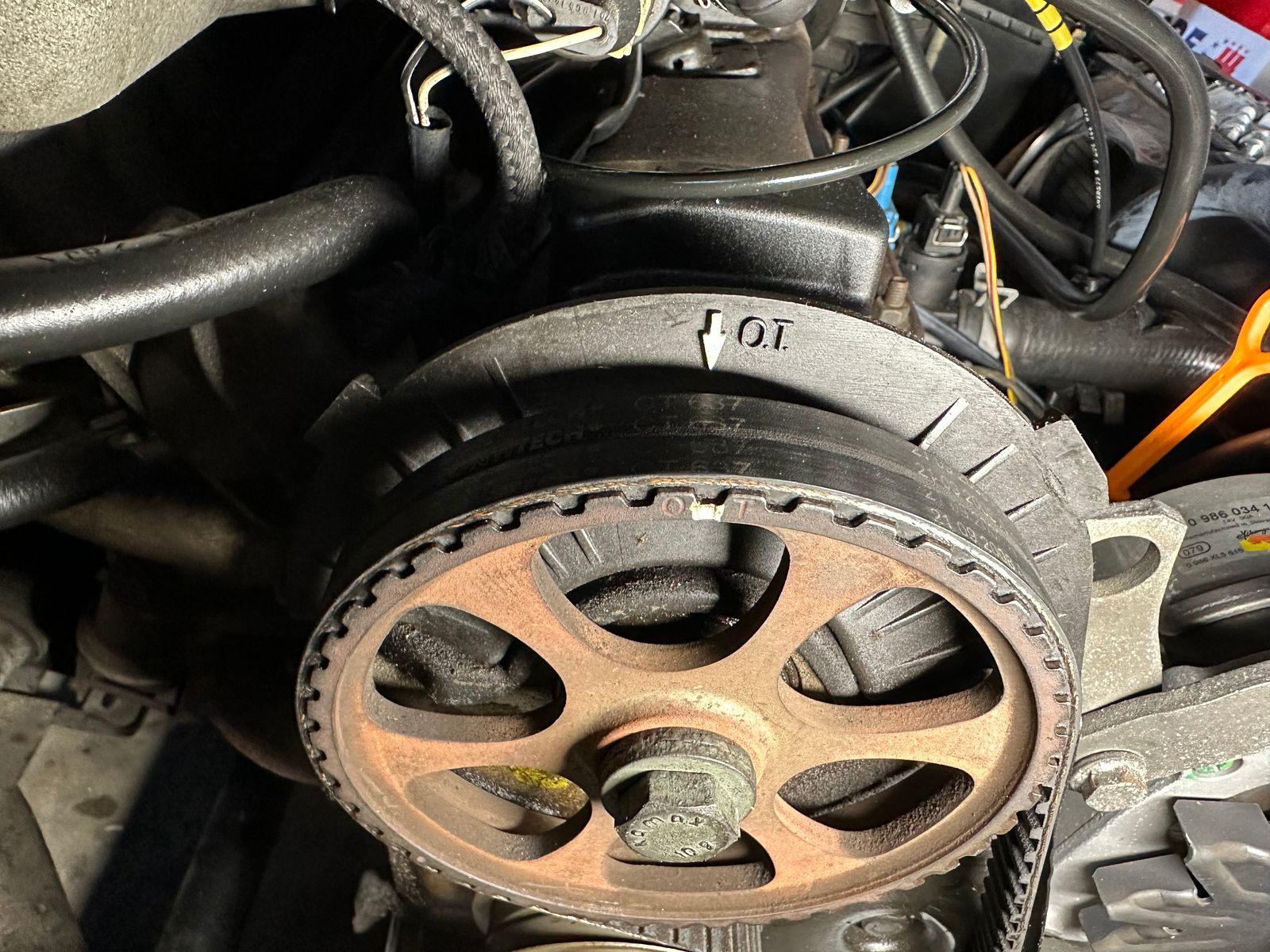 Motor war natürlich kalt. Trotzdem mal blauer Geber ab und geblitzt. 6 Grad Markierung war nun tatsächlich genau auf der Getriebe Markierung. Wie gesagt kalt.